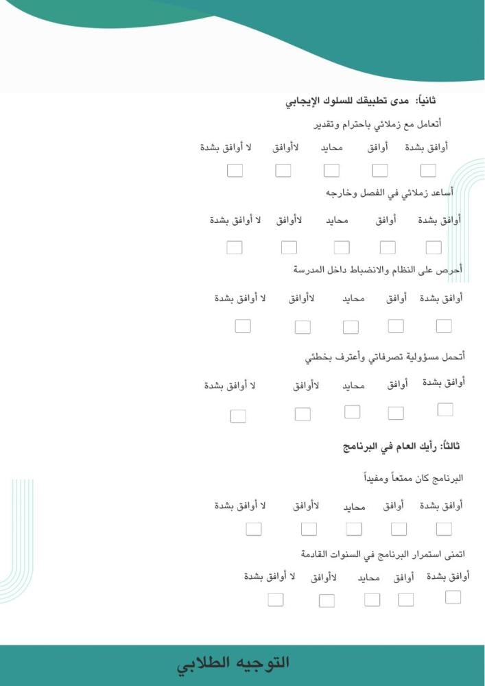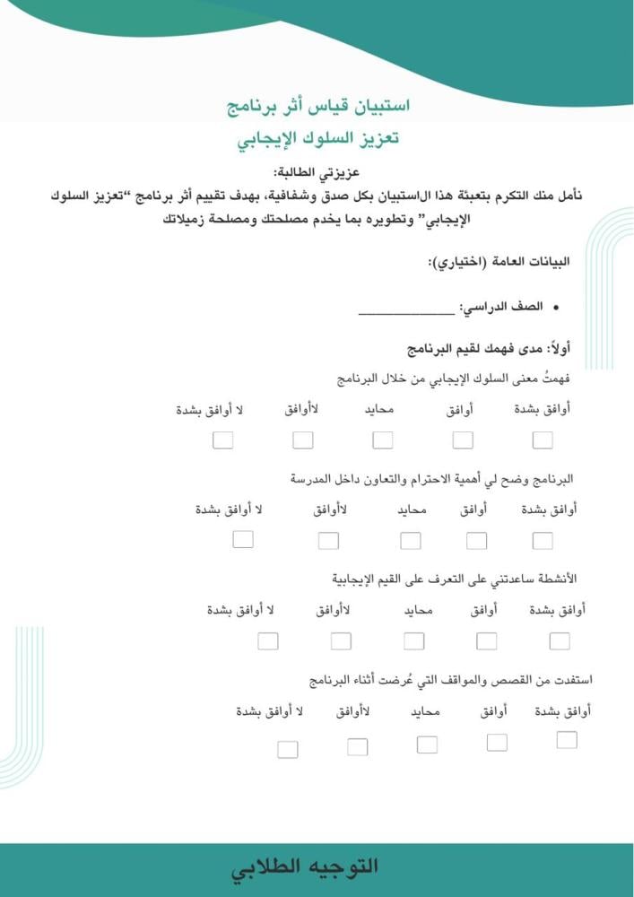 تم إعداد هذا النموذج لقياس مدى تحقيق أهداف البرنامج، والتعرف على الأثر السلوكي والمعرفي لدى الفئة المستهدفة، بما يسهم في تحسين جودة التنفيذ وتطوير البرامج المستقبلية.