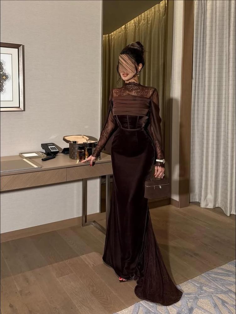 الفستان في الصورة فخم جدًا ومصنوع من قماش المخمل الفاخر بلون بني داكن أنيق يمنحه لمسة دافئة وراقية. يتميز بقصّة ضيقة طويلة تبرز القوام بانسيابية ناعمة وتنتهي بذيل خفيف يضفي عليه طابعًا ملكيًا.