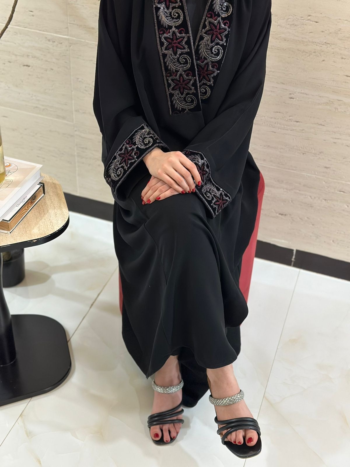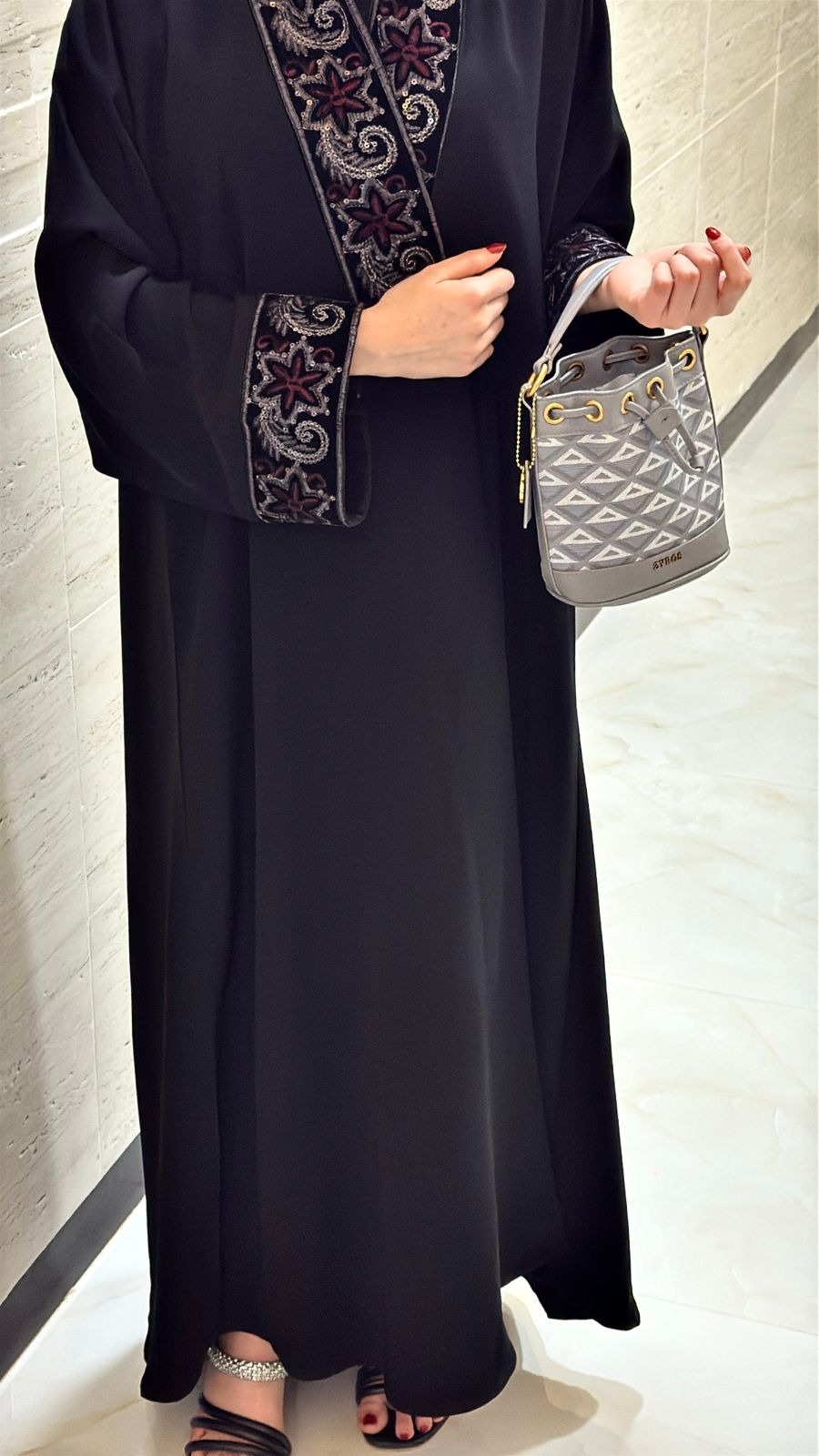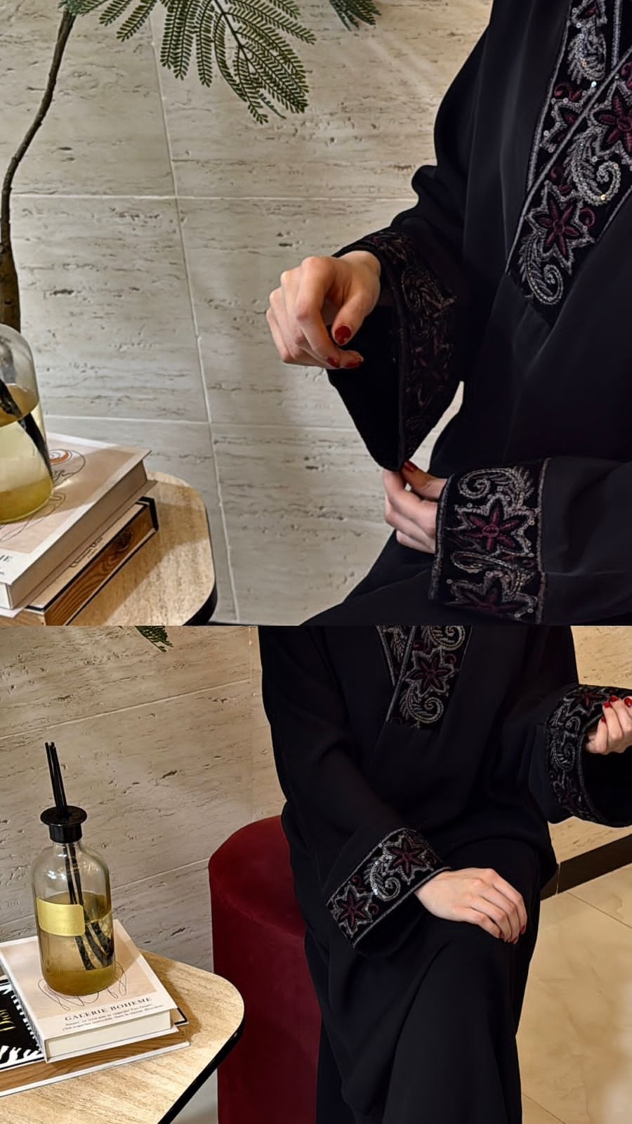 تزين الأكمام ومنطقة الصدر بإطار من المخمل الفاخر، مزين بتطريز رائع باللونين الأود والبينك، مما يضفي لمسة من الجمال والرقي على الإطلالة.