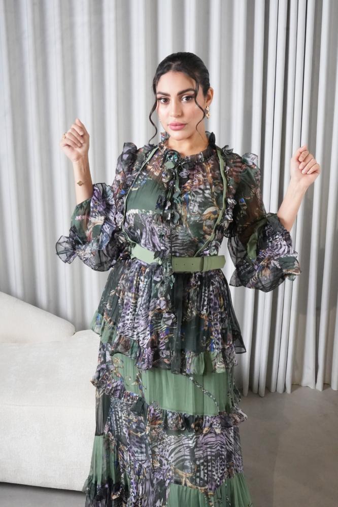 💚 فستان تركي بطبقات فخمة ولمسة أنثويةتألقي بأناقة تركية فريدة مع هذا الفستان الراقي المصمم بطبقات من الشيفون المزيّن بطبعات فنية بدرجات الأخضر العميق والبنفسجي الهادئ.