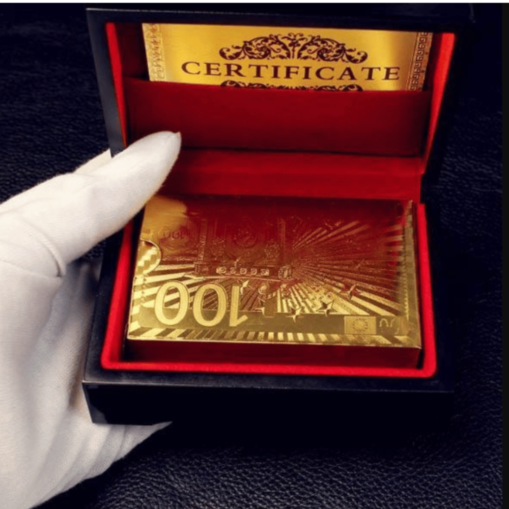 ورق باصرة ذهبي، ورق بلوت ذهبي مجموعة فاخرة من أوراق اللعب بتصميم فريد يشبه ورقة 100 دولار أمريكي، تأتيك داخل علبة فخمة مبطنة باللون الأحمر ومرفقة بشهادة فخامة، ما يجعلها مثالية للإهداء أو للاستخدام الشخصي في جلسات الباصرة أو الكوتشينة.