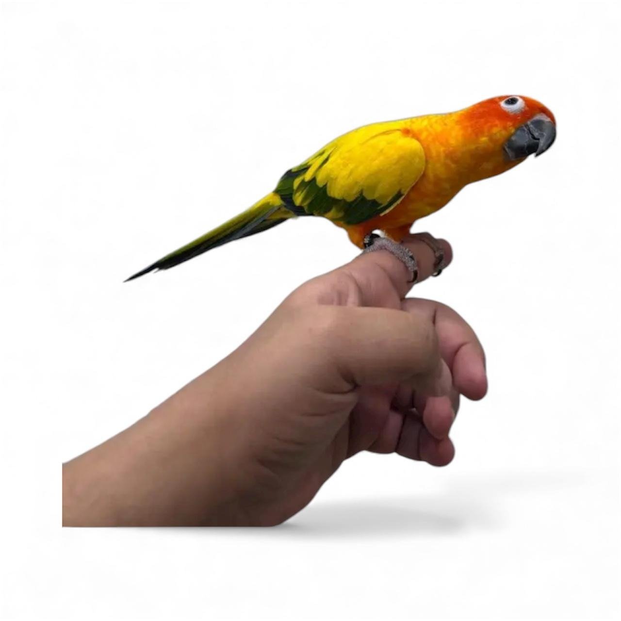 نقدم لك ببغاء "الصن كنيور"، الطائر الأكثر بهجة وشهرة بألوانه الزاهية. بلونه البرتقالي والأصفر الناري، هذا الطائر ليس مجرد رفيق، بل هو "نجم" المنزل وكتلة من الطاقة الإيجابية.