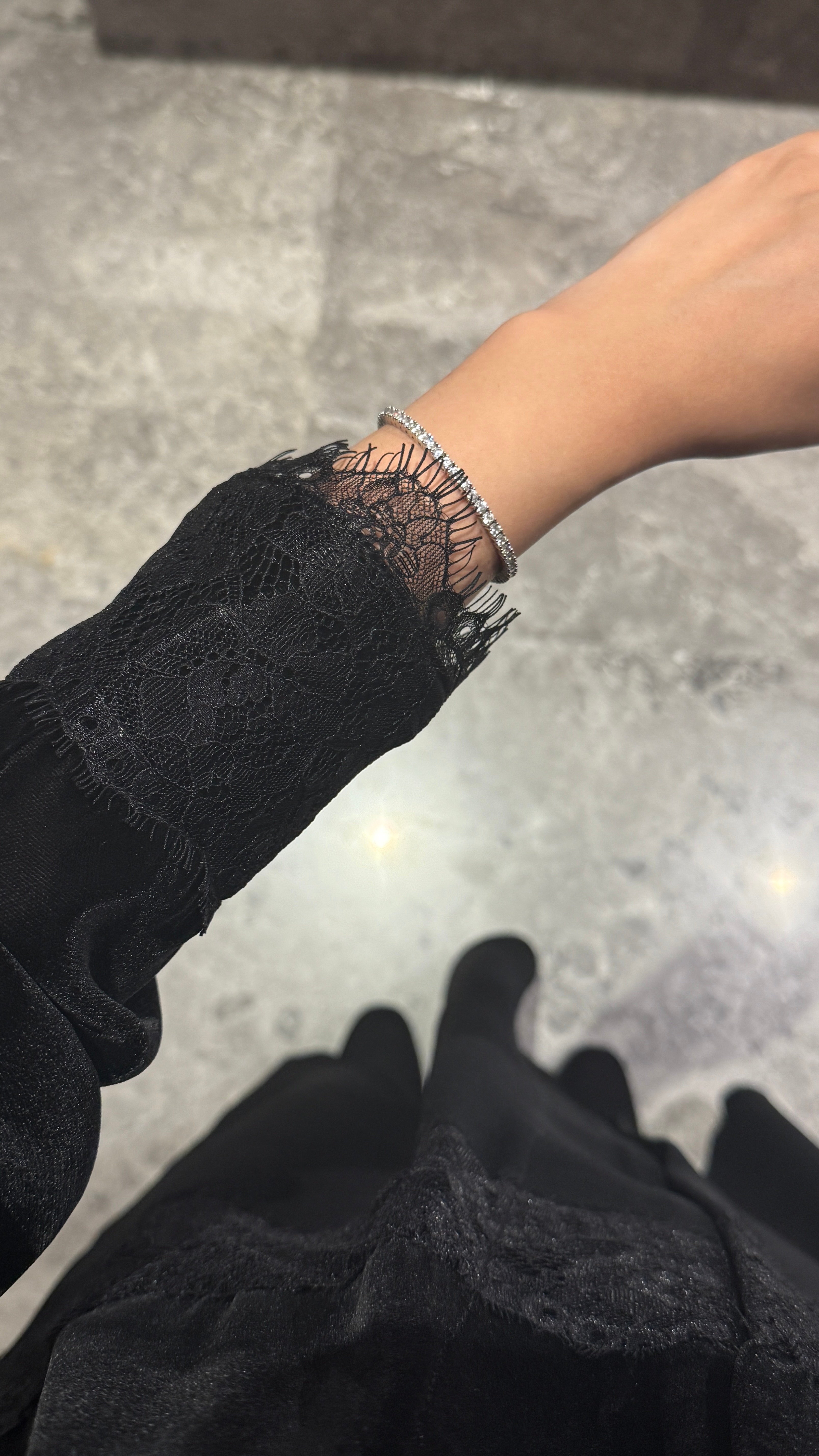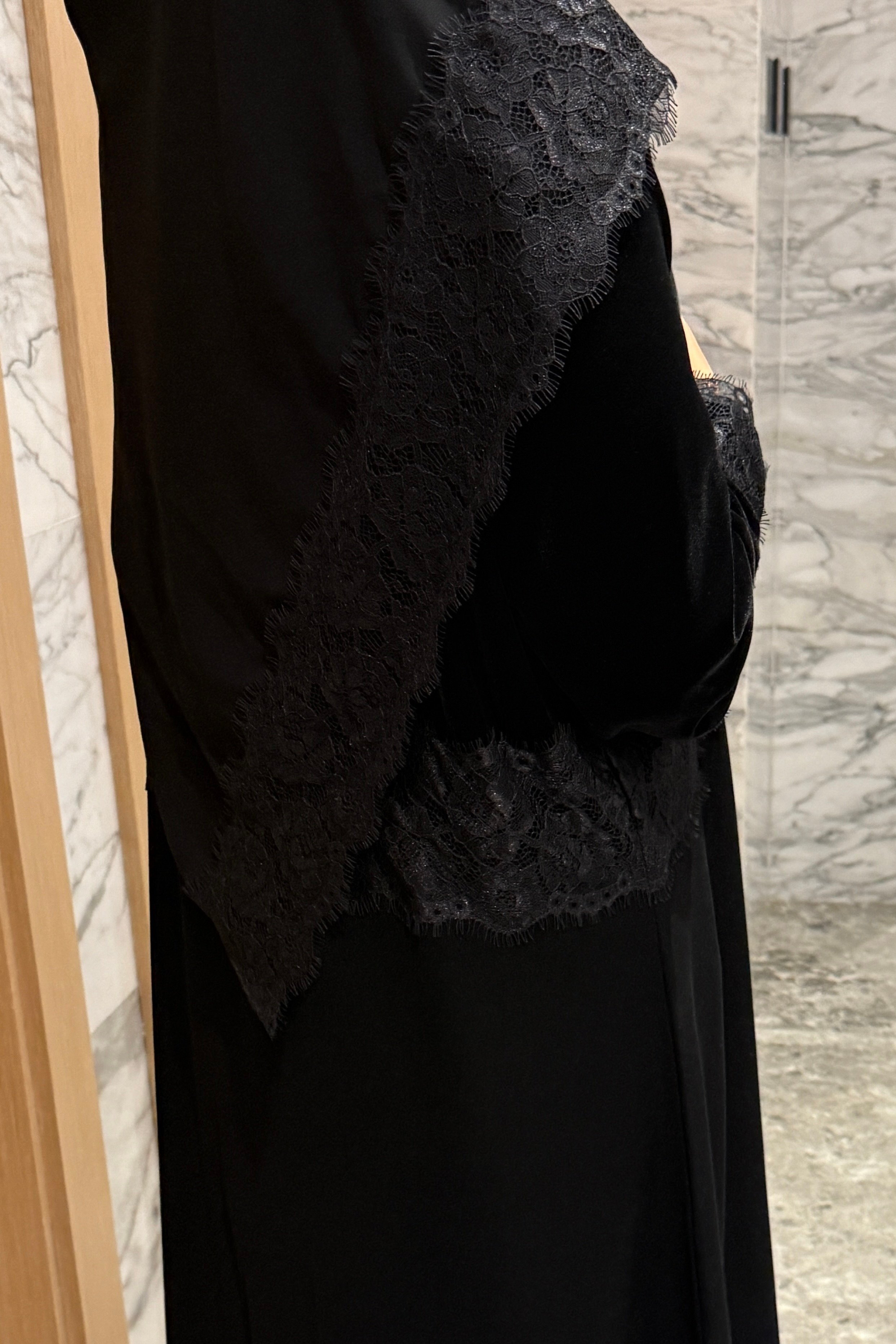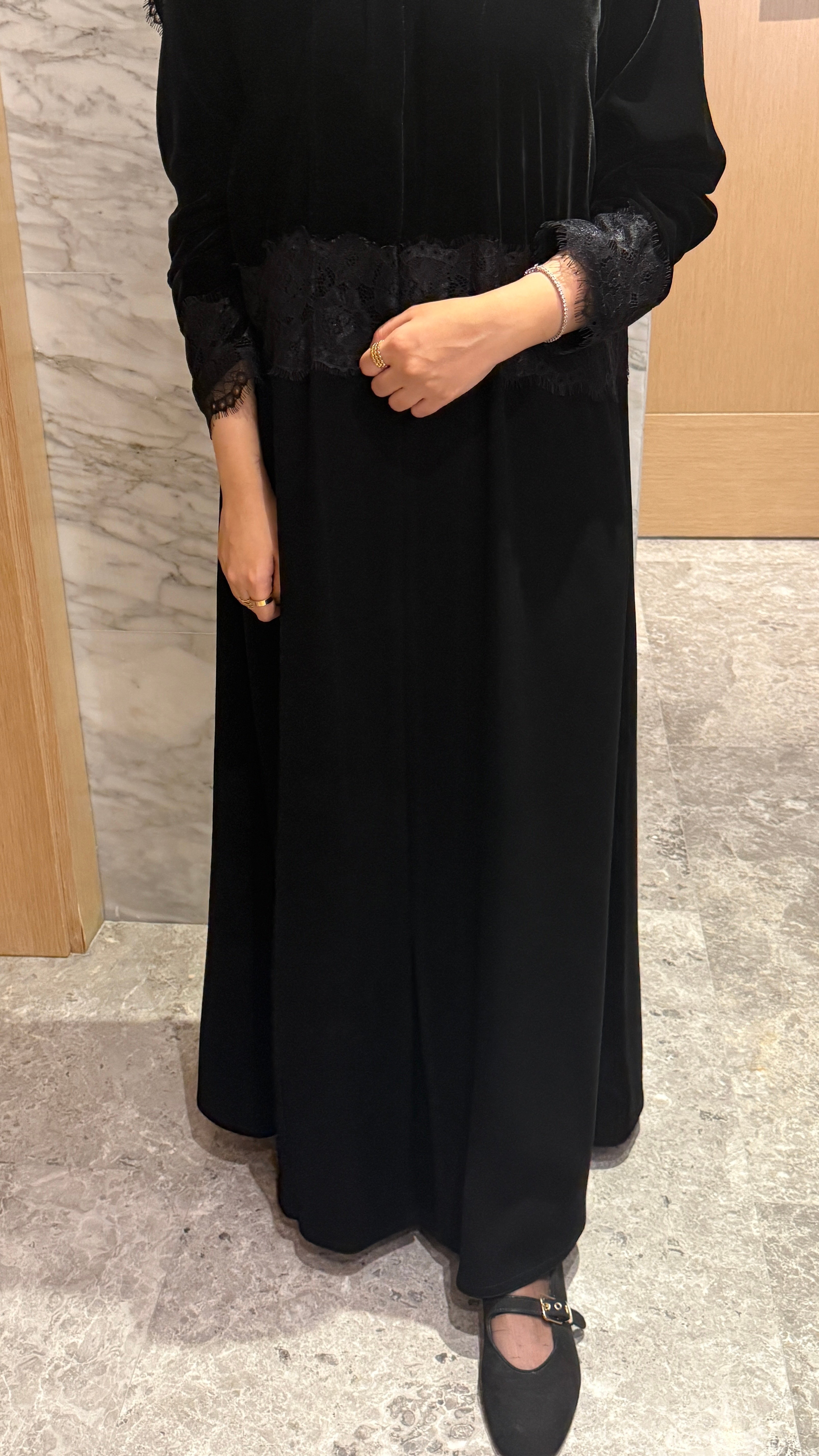 عباية نص مخمل كوري من فوق وكلفه دانتيل بالوسط ومن تحت كريب اندنوسي.قصة العباية : نص كلوشالمرفقات : طرحة بطرف دانتيل.