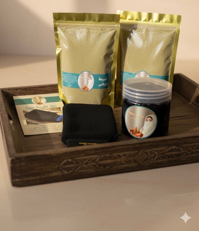 يحتوي بوكس الحمام المغربي علي صابون مغربي بالنيلة و تبريمة بالاعشاب و ليفة مغربية … مع اريناس تمتعي بحمام مغربي اصيل 💙