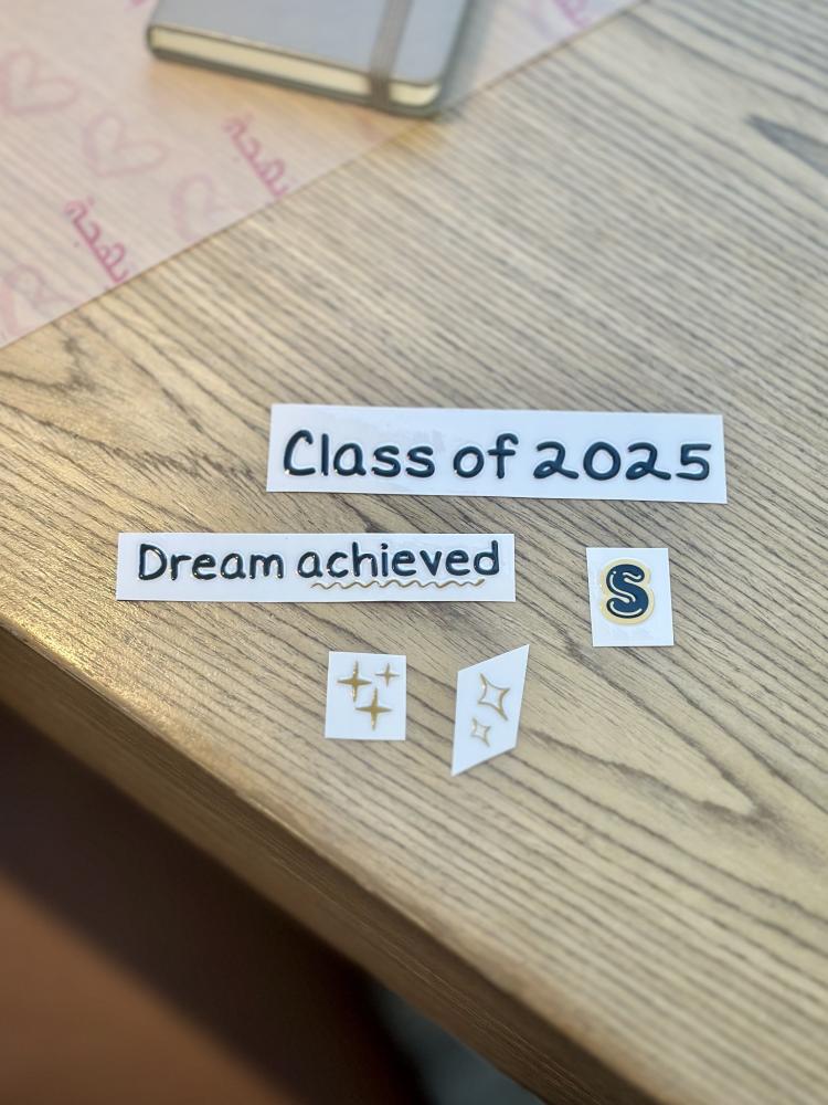 مجموعة من 5 ستيكرات : 1- class of 2025 2- Dream achieved 3- حرف قابل للتغيير 4- نجوم بشكلين مختلفة مناسبه لجميع الأسطح، مثل: الأكواب أو المق كڤر الأيب...
