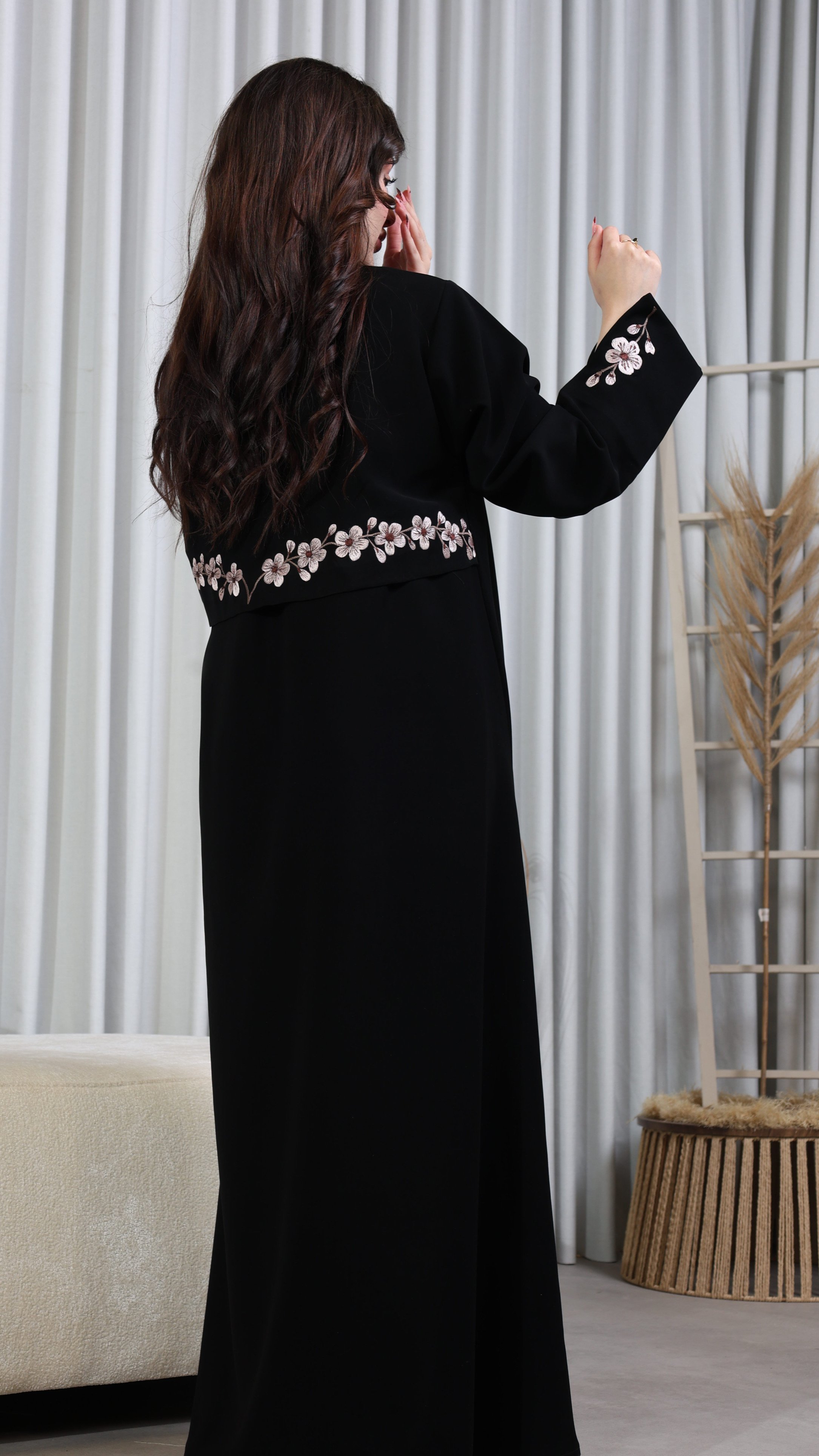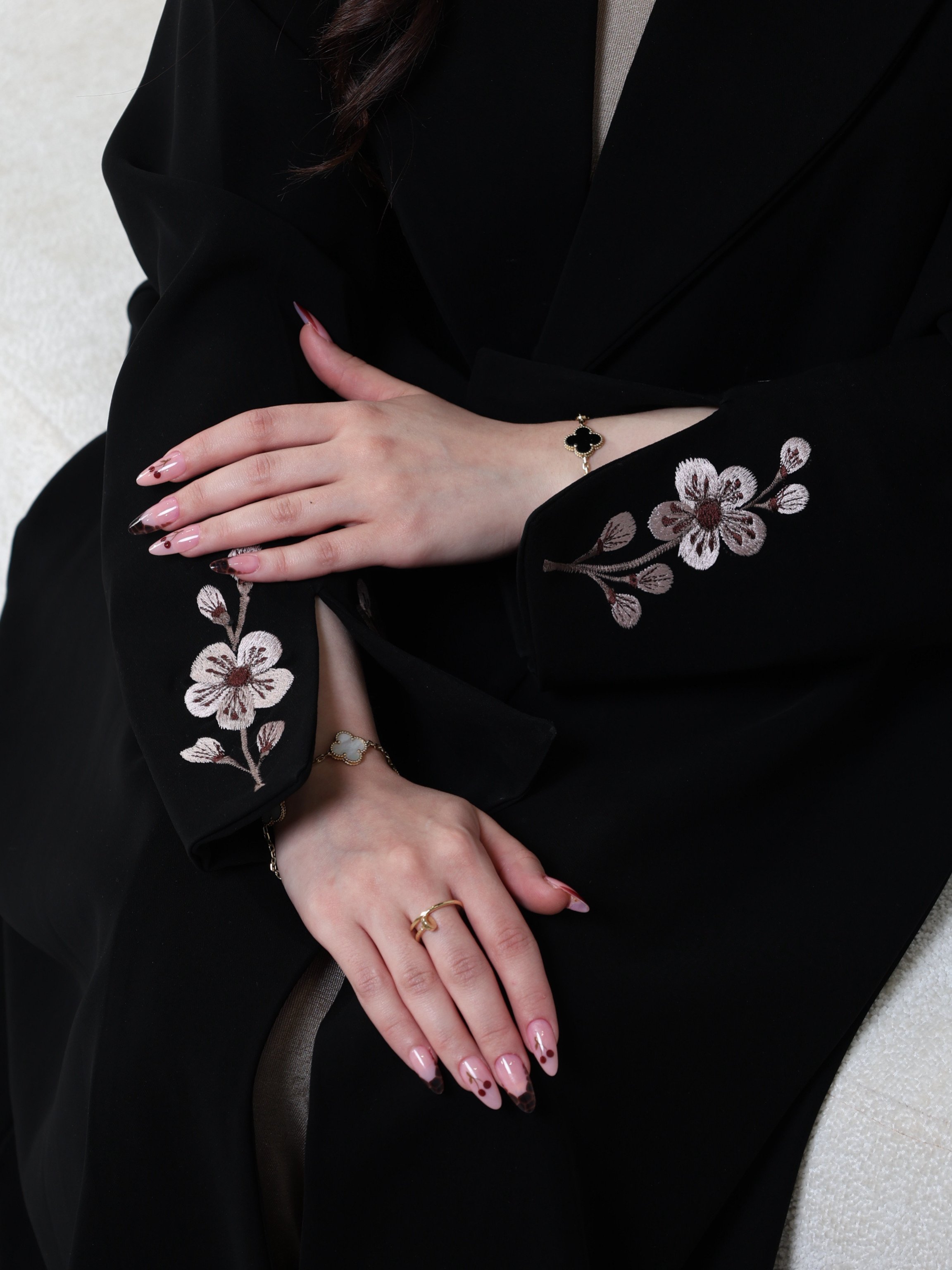 عباية زهرة الساكورا مصنوعة من كريب فاخر عملي، بتطريز أنثوي مستوحى من أزهار الساكورا على الأكمام والظهر.