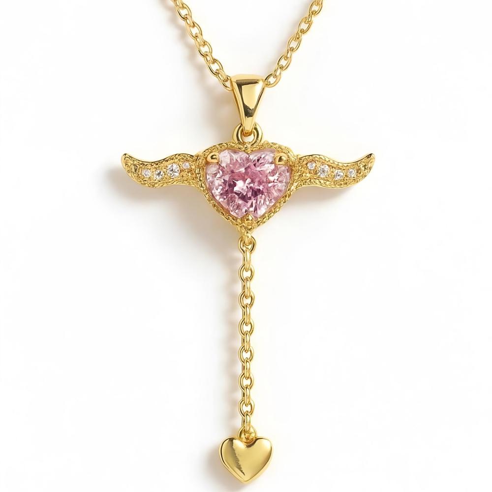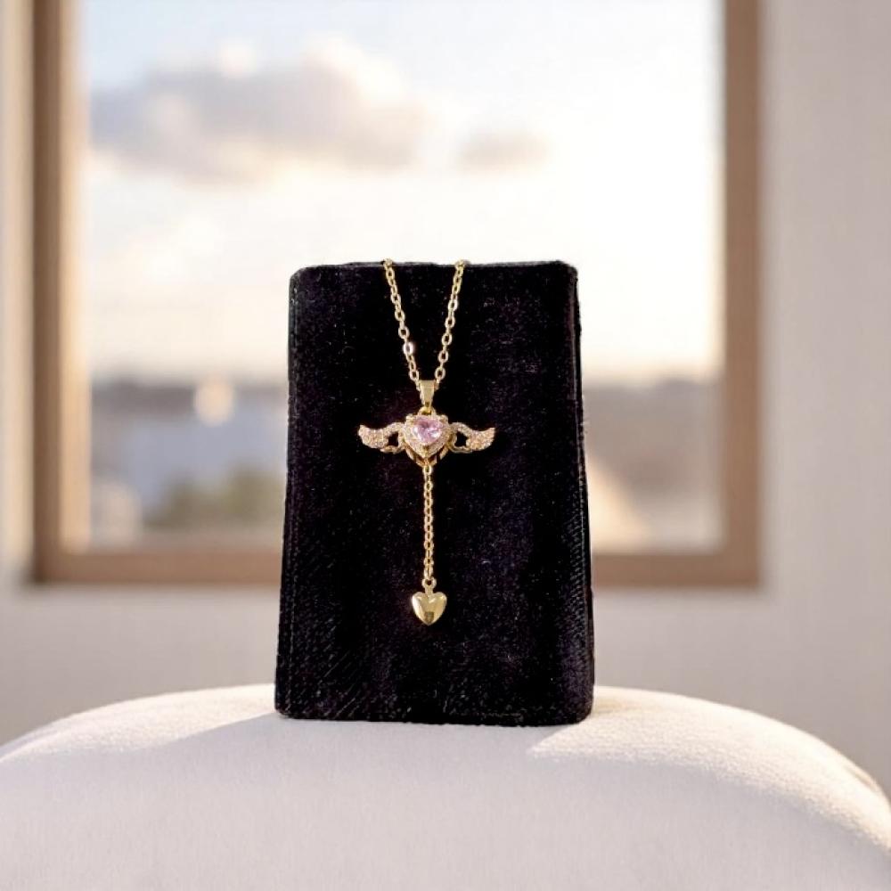 دللي نفسك أو من تحبين بعقد ينبض بالرقة، يتميز بحجر على شكل قلب وردي ينبض بالعاطفة، تحيط به أجنحة لامعة تُجسّد الحنان والحماية، وتنتهي بسلسلة أنيقة تحمل قلبًا ذهبيًا صغيرًا يتمايل بنعومة مع كل خطوة✨