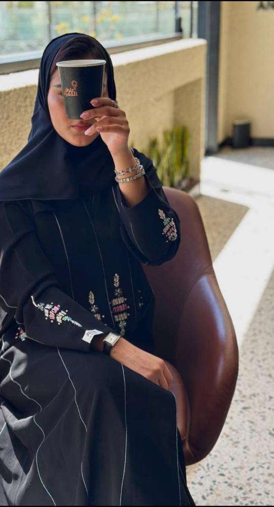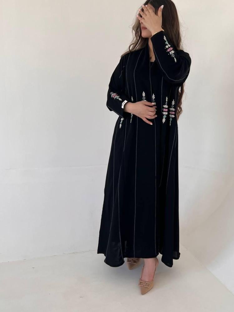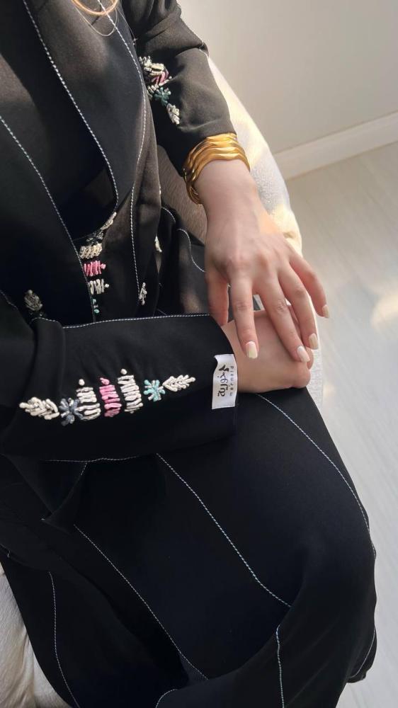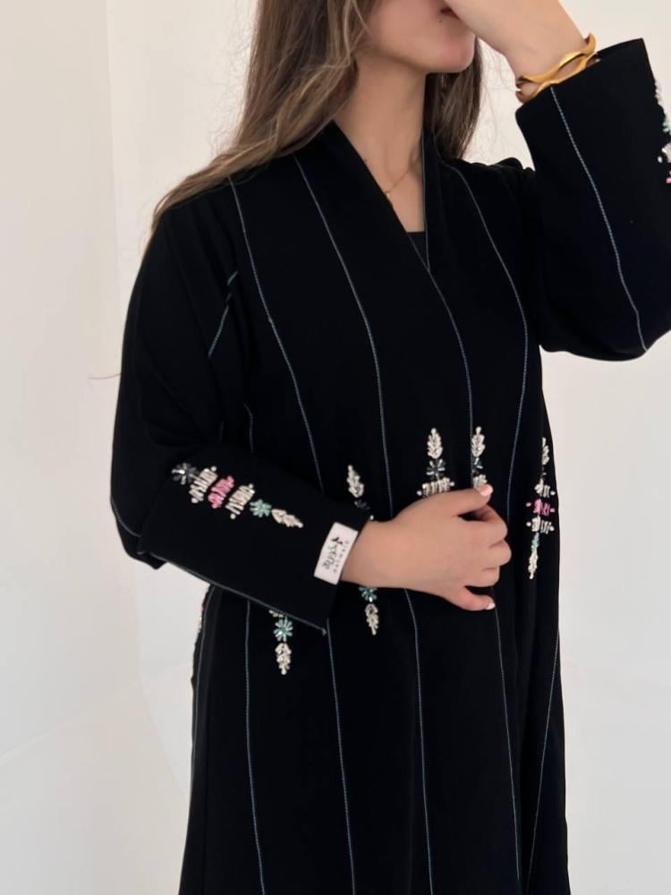 عباية دُره . عباية سوداء أنيقة من قماش كريب سيراميك ، بتطريز ناعم بألوان زهرية وبيضاء وتركواز على الصدر والأكمام، مع خطوط طولية دقيقة تضيف لمسة من الانسيابية والرقي