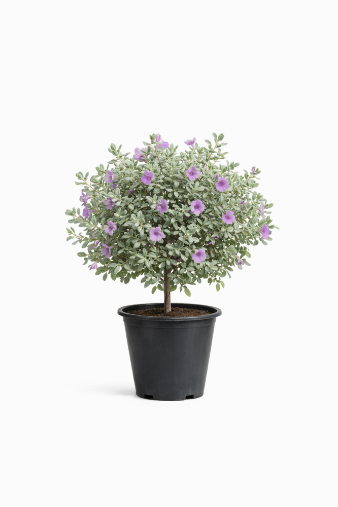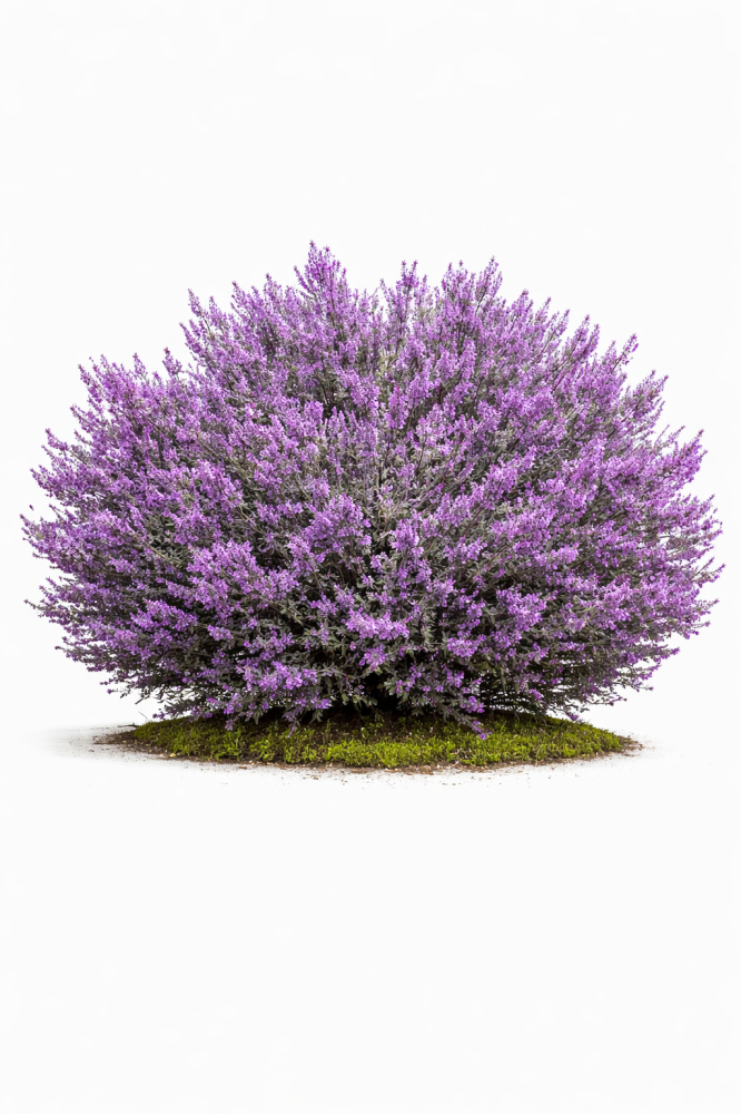 تتميز الليكوفيليوم (Leucophyllum / المريمية التكساسية) بنمو شجيري كثيف ومستدير، وأوراق بيضاوية صغيرة ذات لون فضي رمادي وملمس مخملي ناعم، وتتألق أزهارها بشكل جرس صغير بلون أرجواني أو وردي فاتح يغطي كامل النبات؛ وهي نبات فائق التحمل للحرارة الشديدة والجفاف والملوحة.