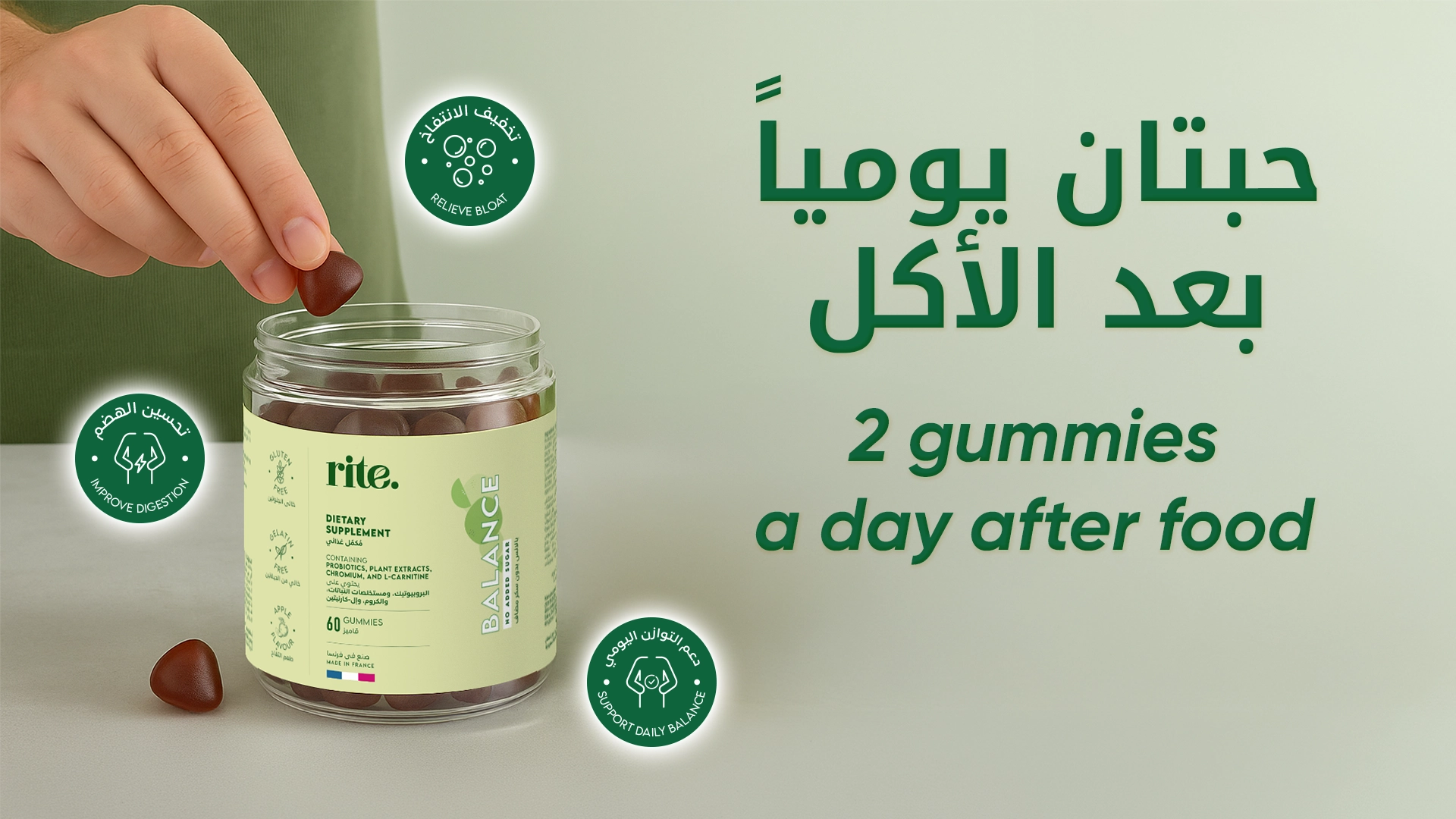 قاميز رايت. بالانس مكمل غذائي مُصاغ بعناية، يحتوي على البروبيوتيك ومستخلصات نباتية أساسية كالشمر والخرشوف وبذور الكولا والكروميوم، للمساعدة في تحسين الهضم، ودعم توازن الأمعاء، وتقليل الانتفاخ، والمساهمة في العافية العامة كجزء من نمط حياة صحي.
