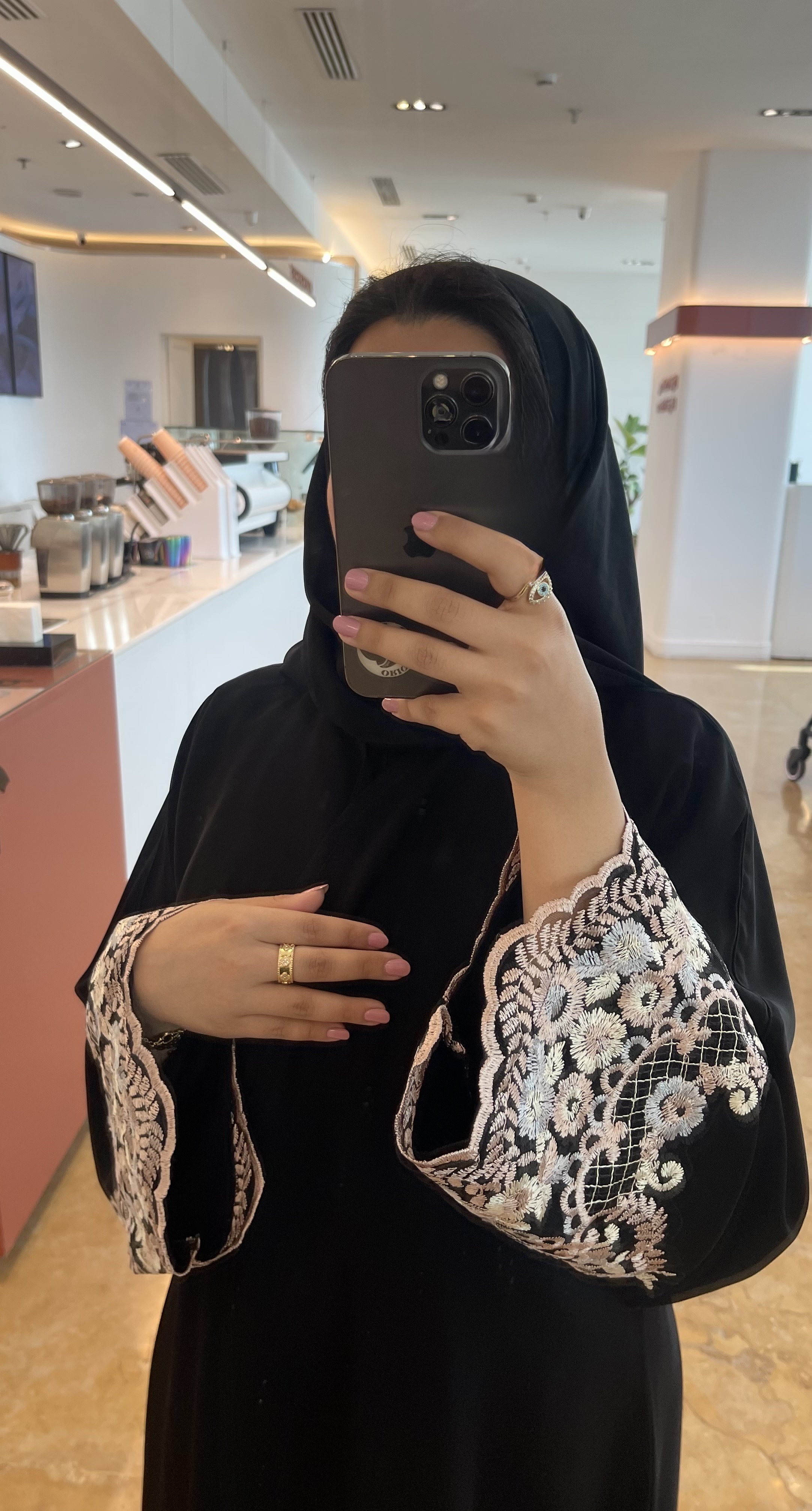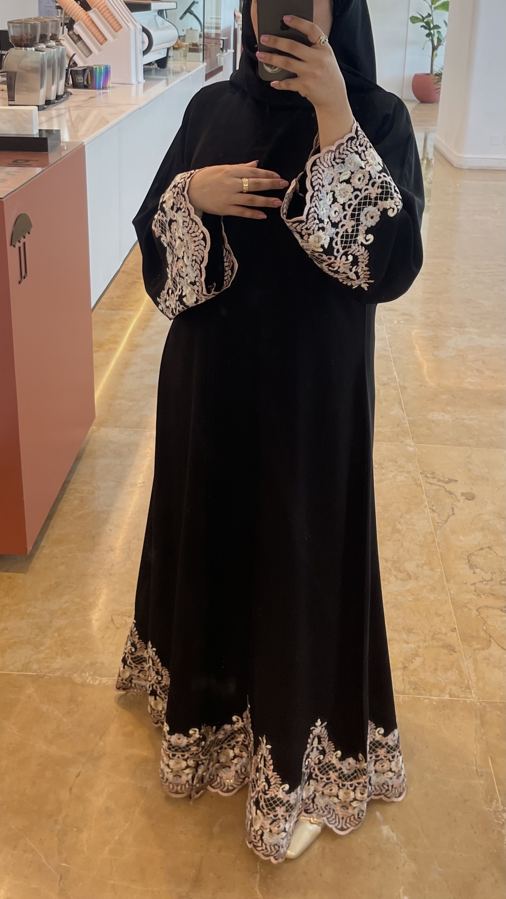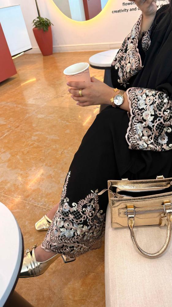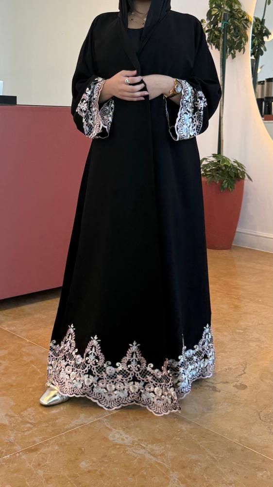 عبايه الورد قماش ملكي كوري قصه ربع كلوش مع كلفة مطرزه بالورد 🪡🤍متوفرة بالوردي والبيجإضافه الكلفة على الطرحه ( +40﷼)