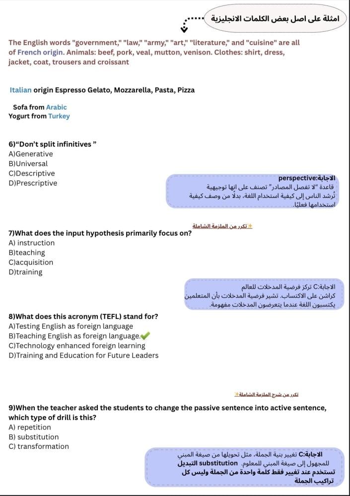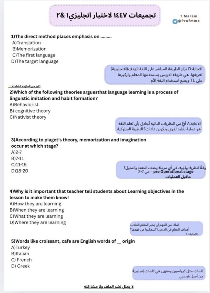 ملف يحتوي على ٥٢ سؤال من تجميعات اختبار الرخصة المهنية انجليزي ١٤٤٧ مع الحل والشرح المبسط لأغلب الاسئلة 🥇🤩🤩