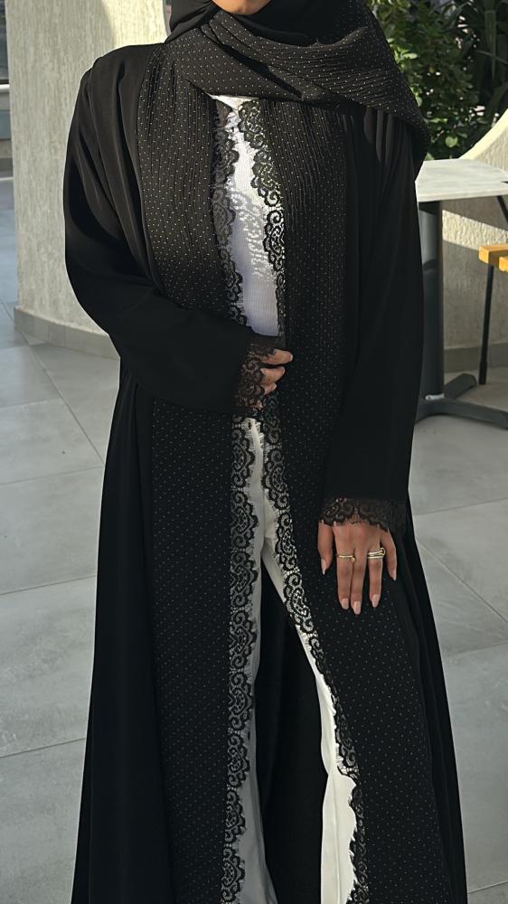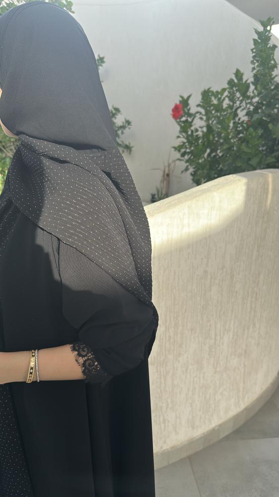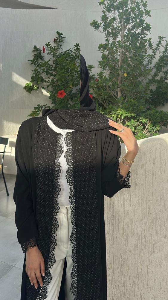 أنيقة بتصميم كلوش ، تتميز بنوعين من القماش الكريب الكوري المعروف بسواده الفاحم لايحتاج للكوي ،مع الكشمير العصري المنقط بنقاط صغيرة بأضافة الدانتيل للأكمام ومقدمة العباية