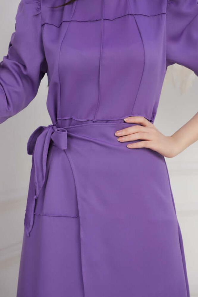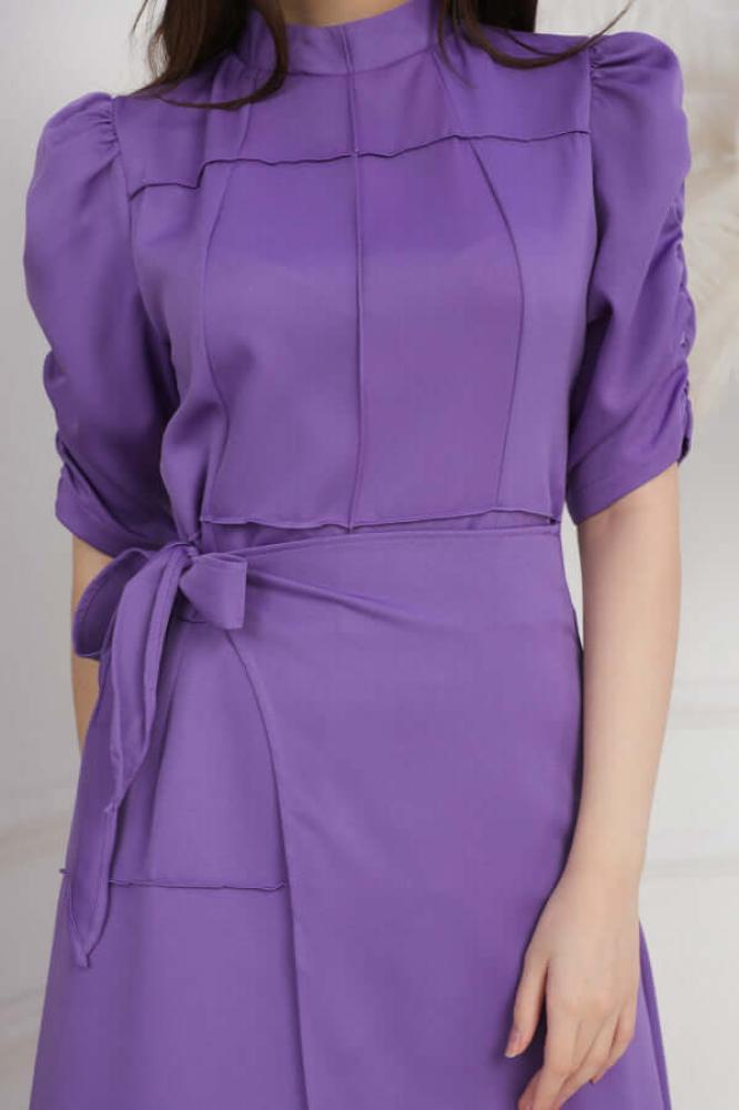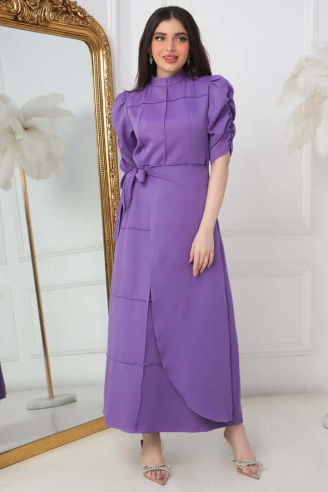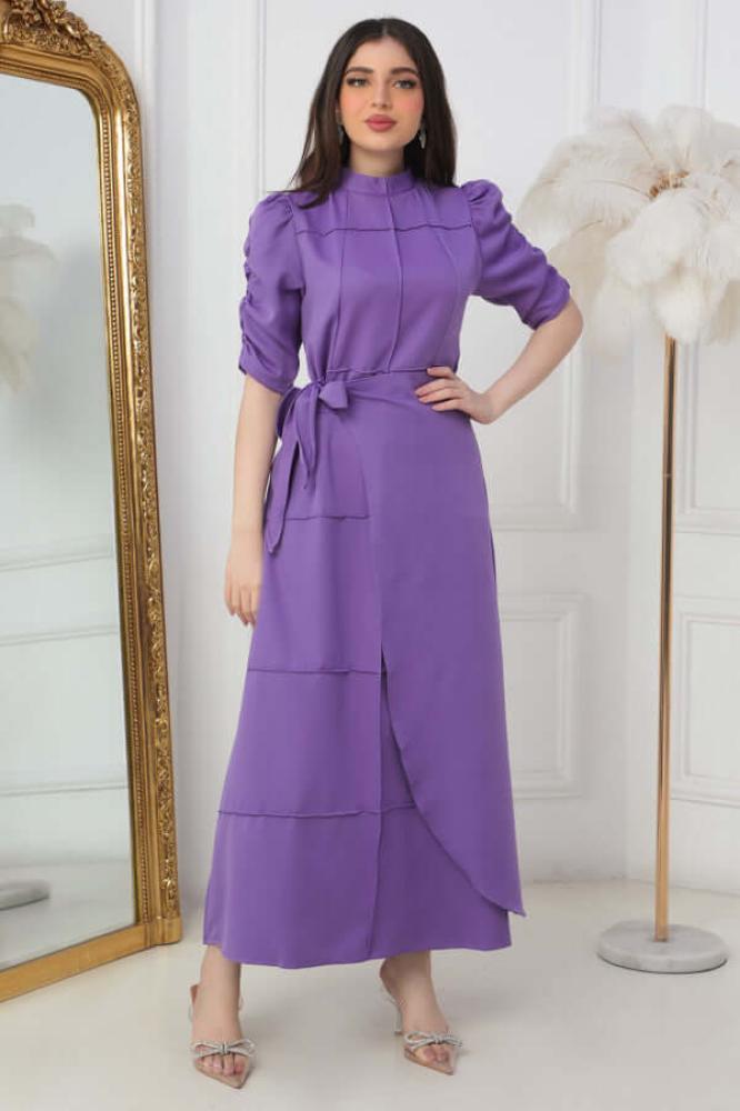 - نوع القصة: طويل بلف على الخصر مع رباط، بياقة عالية وأكمام قصيرة مزمومة