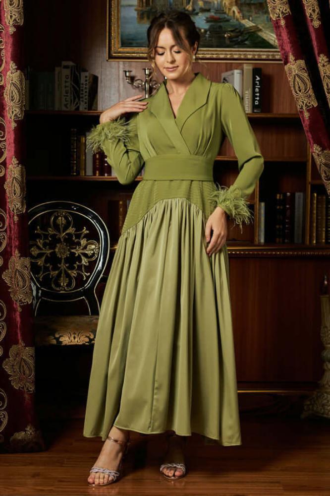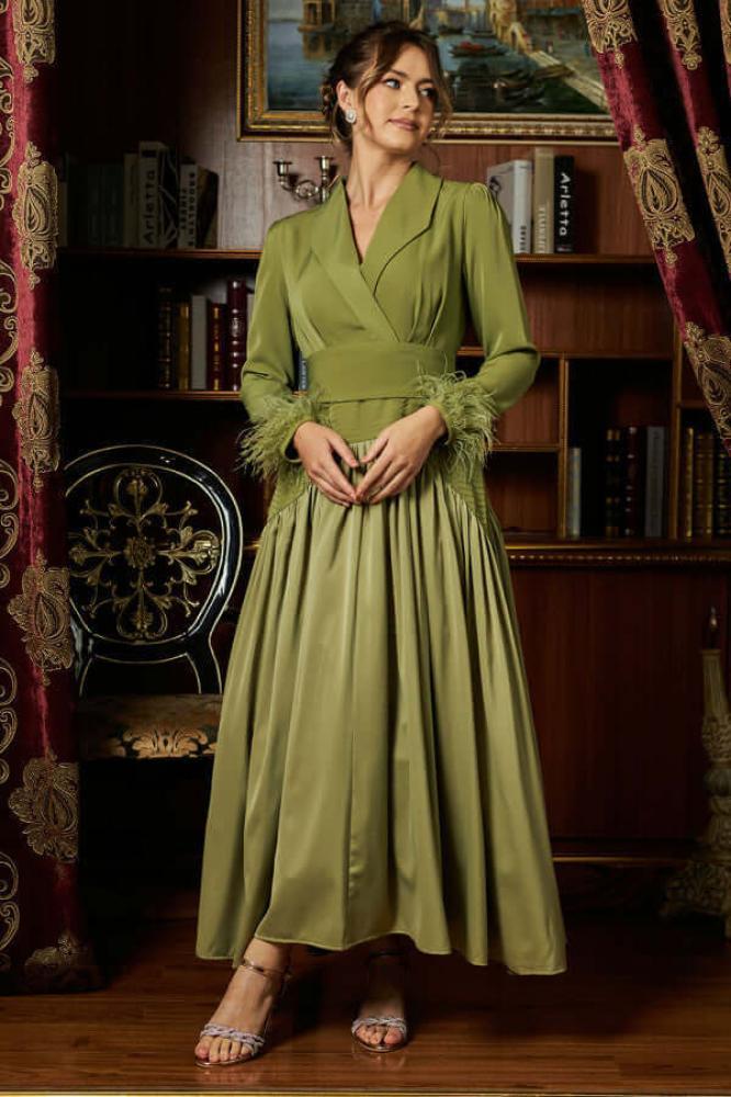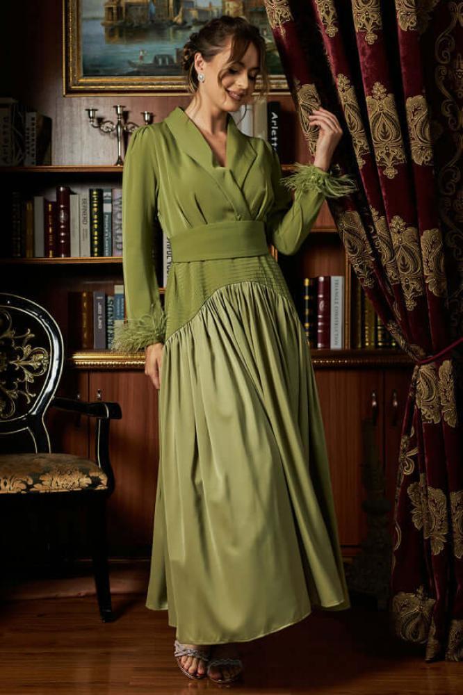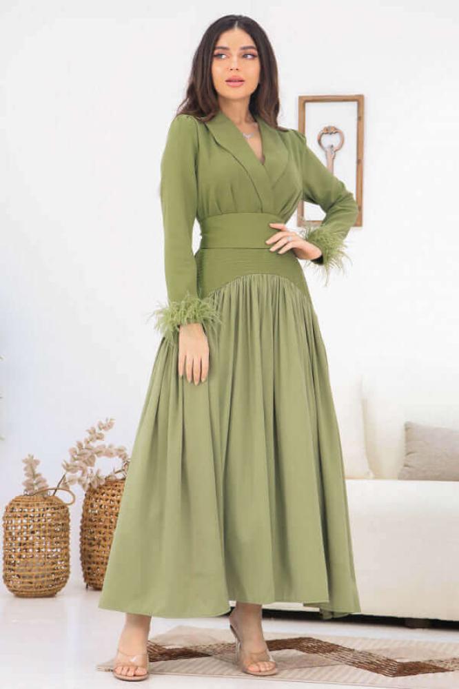 - نوع القصة: طويل، بتصميم مقسم، مزود بزم كلوش وحزام على الخصر، بياقة V وأكمام طويلة مزينة بريش