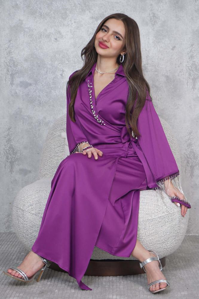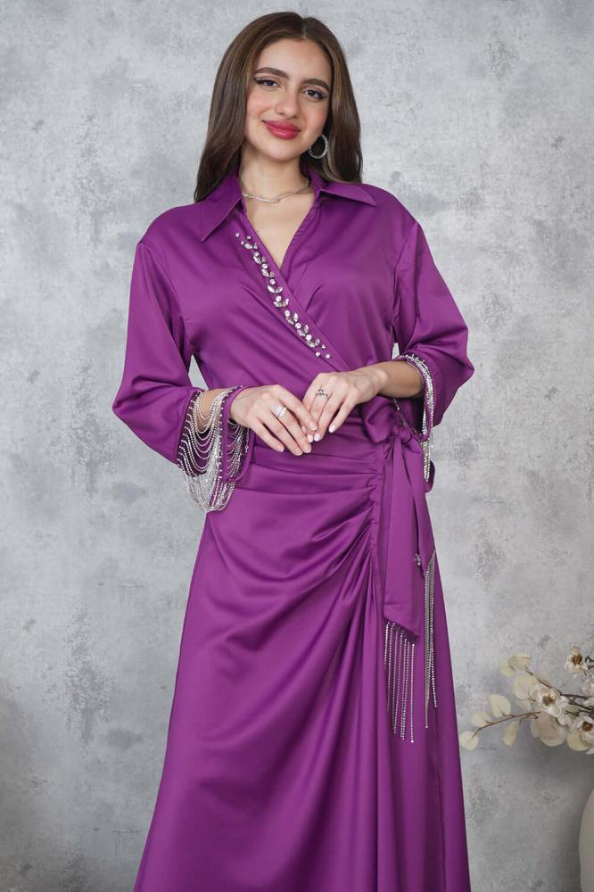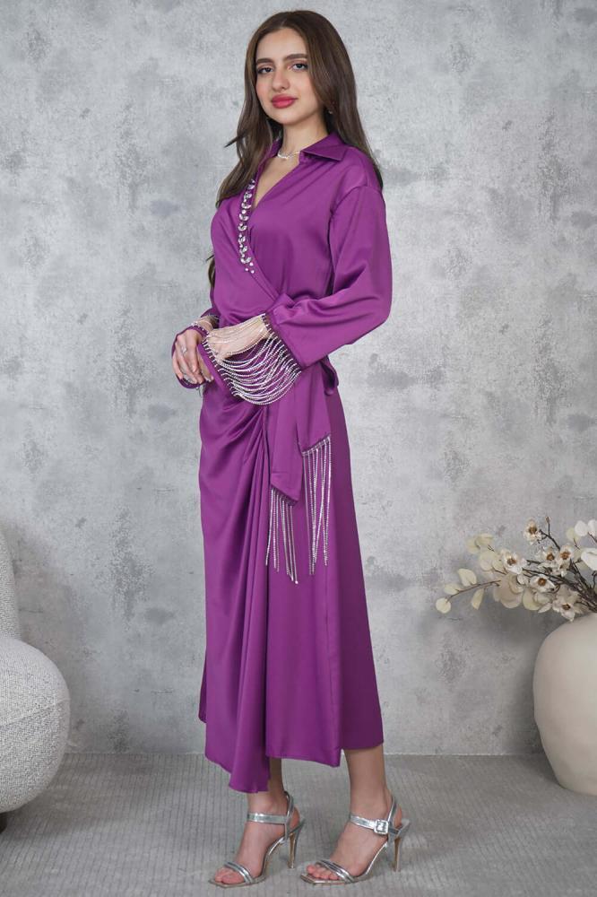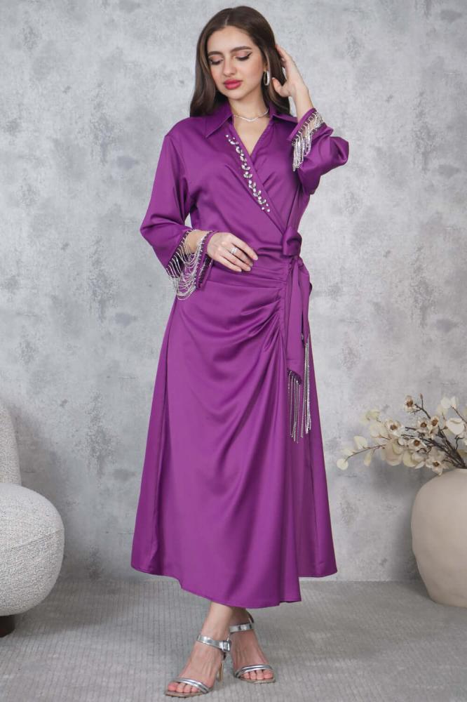 • نوع القصة: ميدي بتصميم لف، برباط، وياقة V مطوية، بأكمام طويلة مزينة بشراشيب كريستال