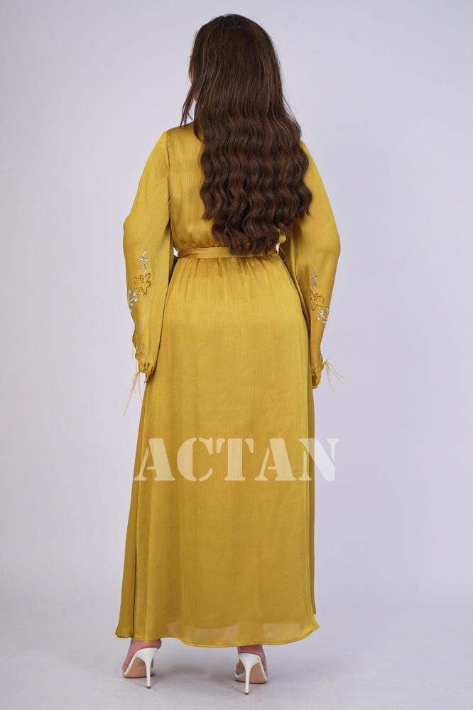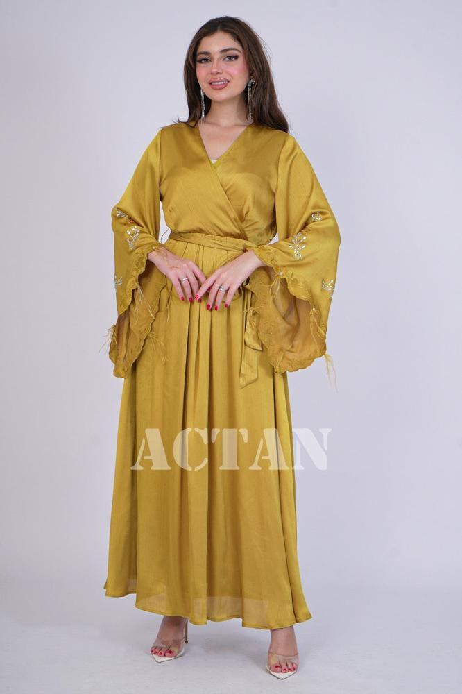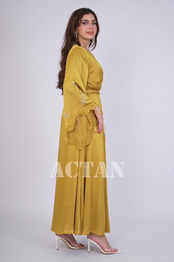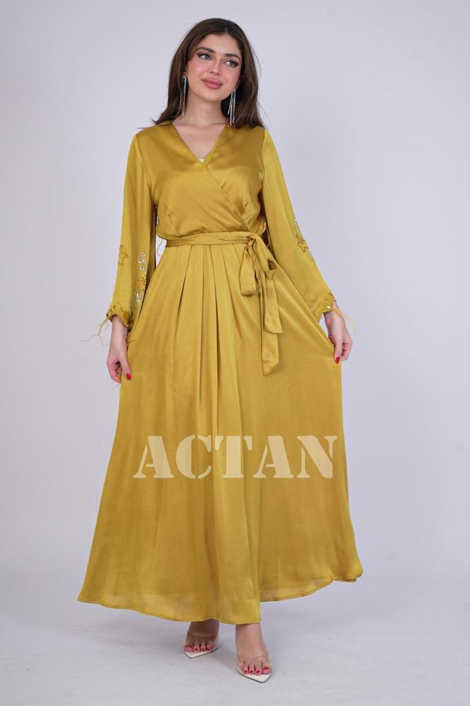 - نوع التصميم: فستان ساتان بأكمام مزينة بكريستال