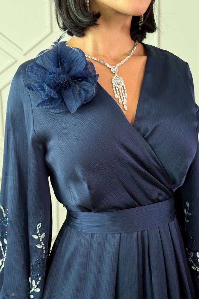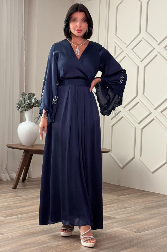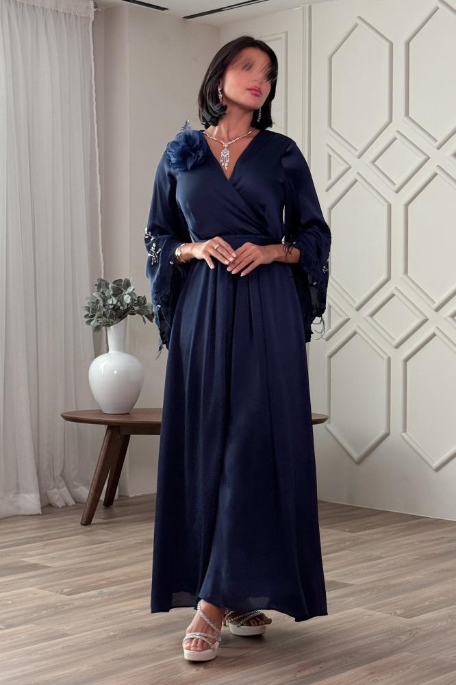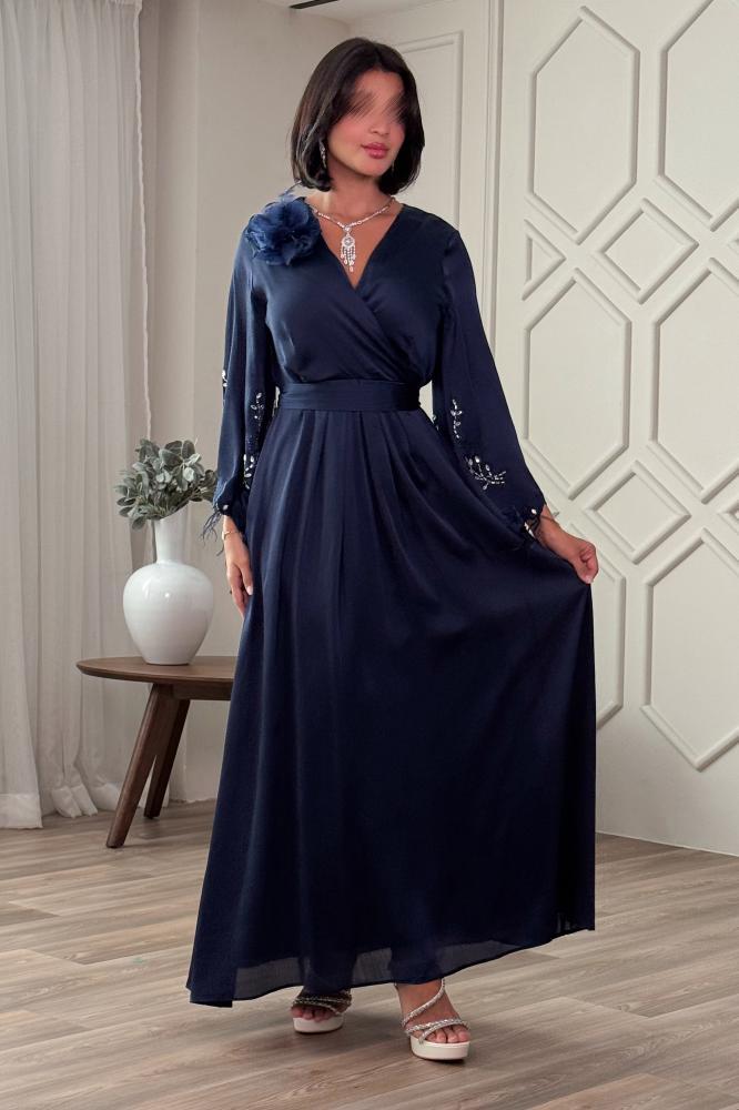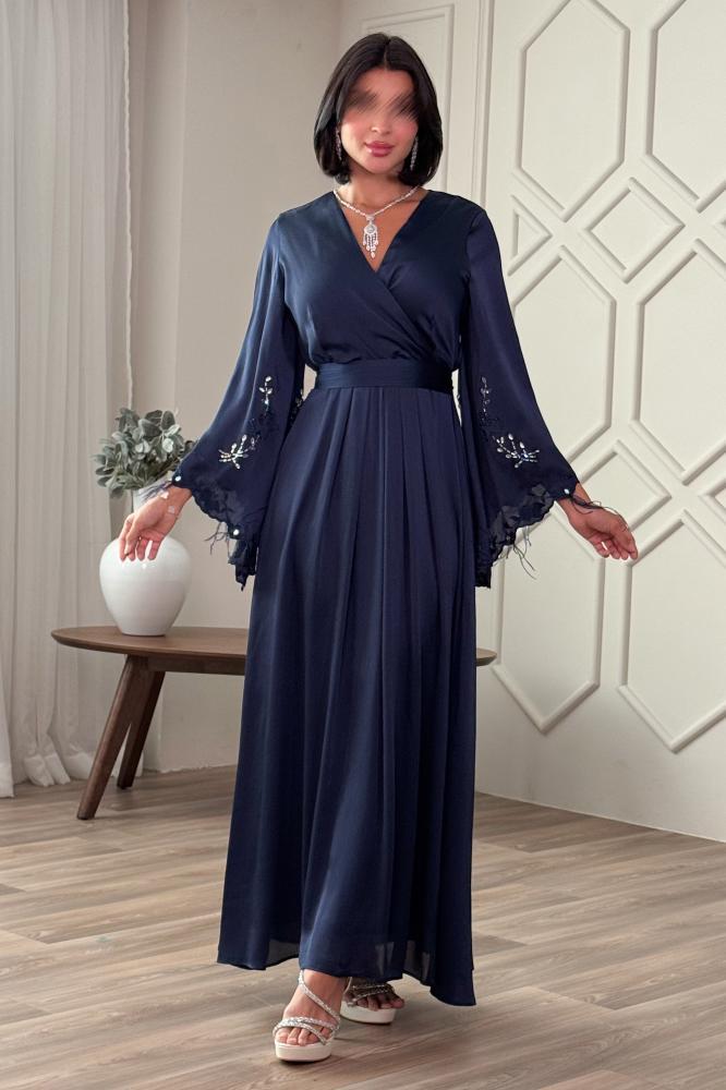 - نوع التصميم: فستان ساتان بأكمام مزينة بكريستال