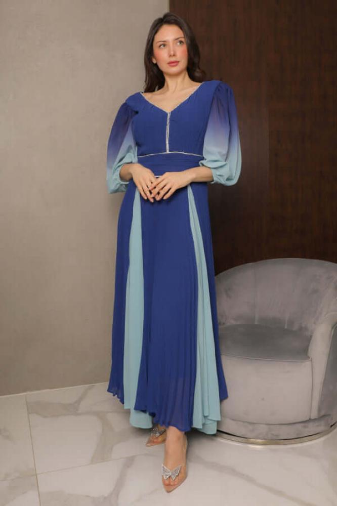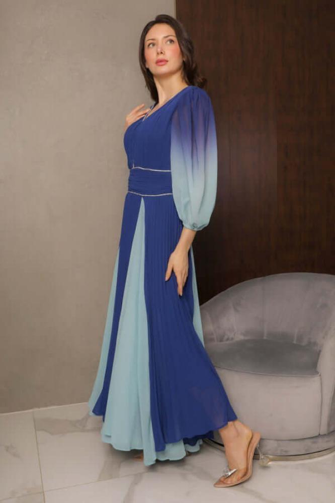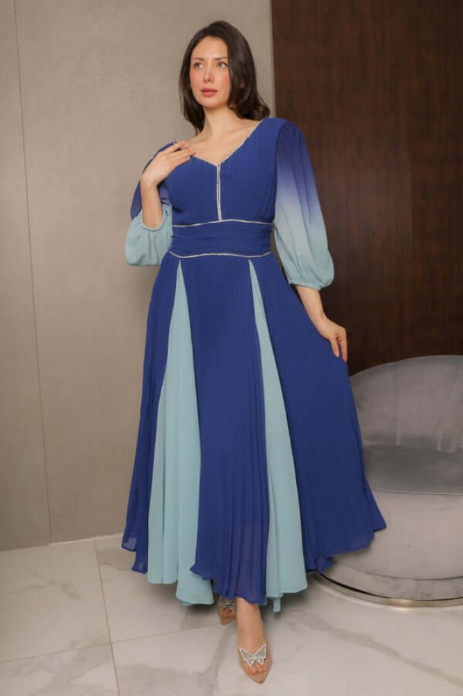 - نوع التصميم: فستان سهرة شيفون بكسرات، بأكمام حيران