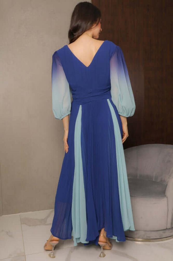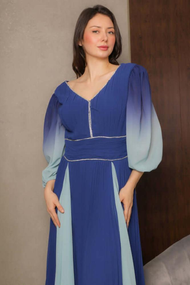 - نوع القصة: طويل، بكسرات أزرق وسماوي من الخصر، وياقة V