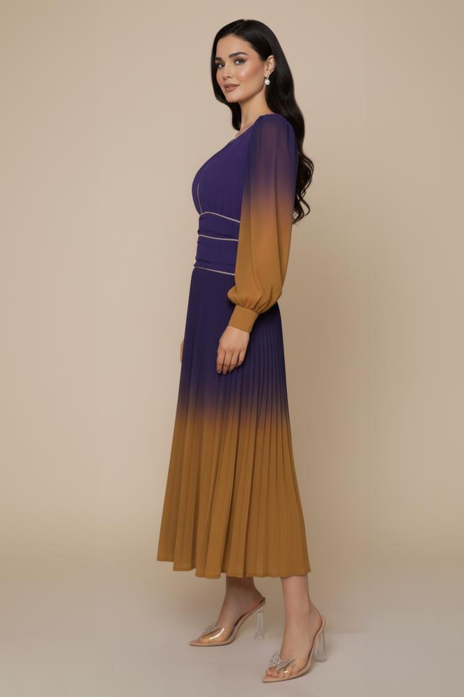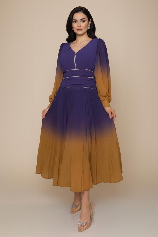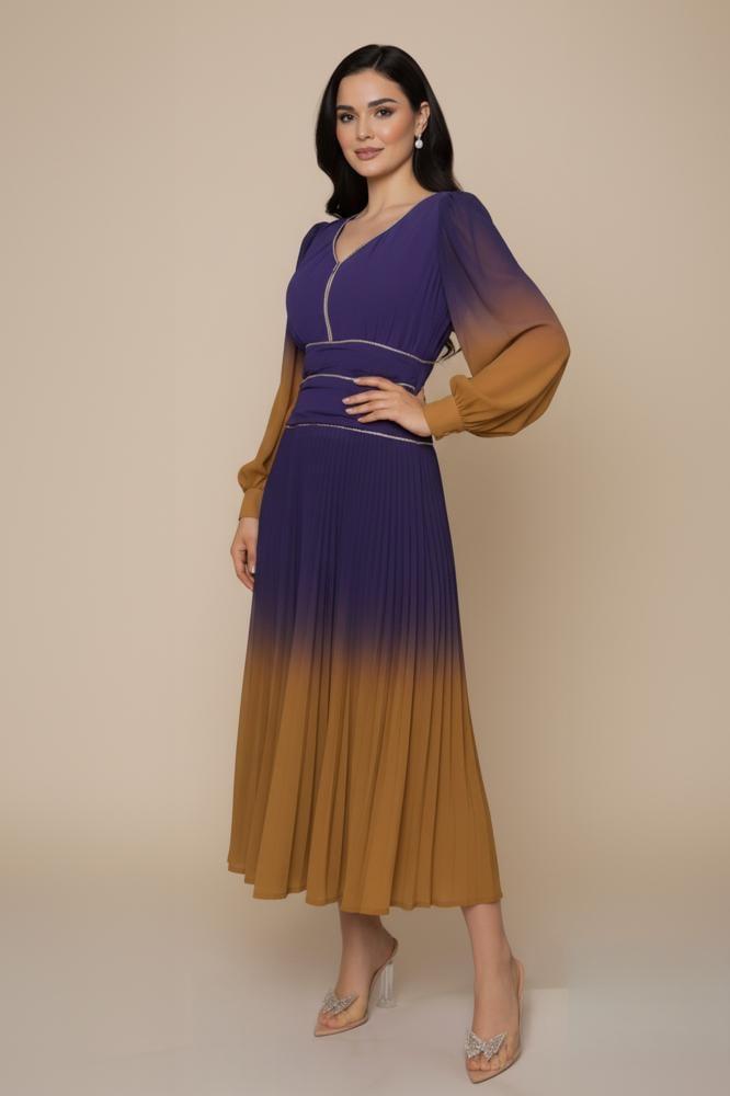 - نوع القصة: فستان ميدي بلونين (بنفسجي وكاكي) مزين بكسرات من الخصر مع ياقة V وأكمام طويلة