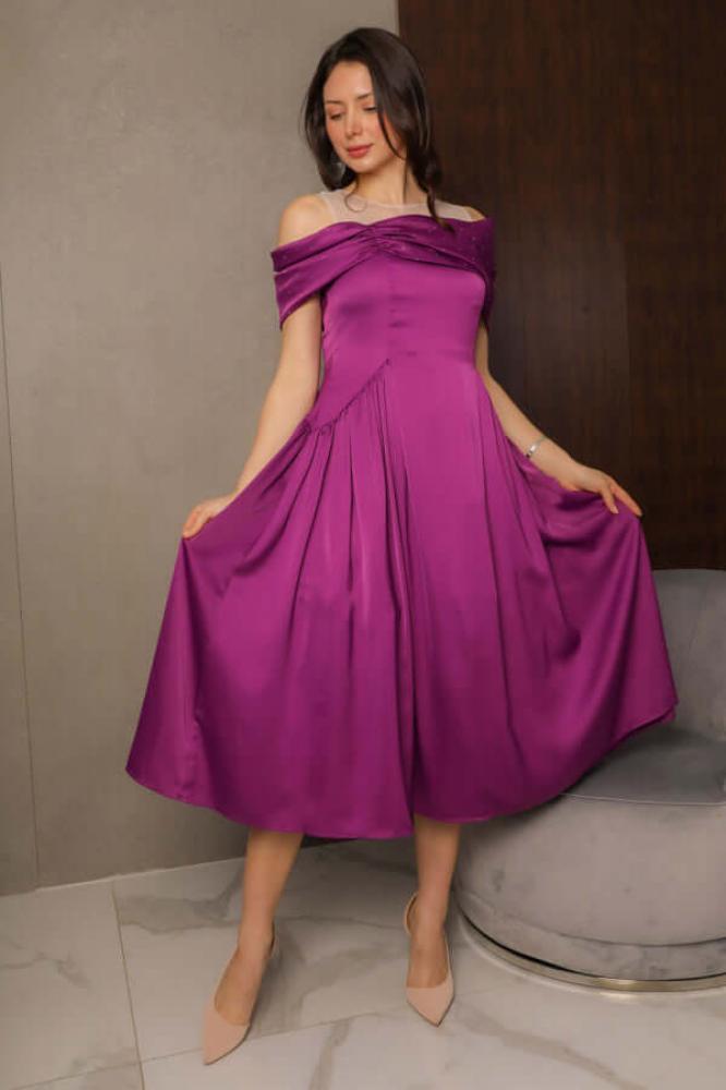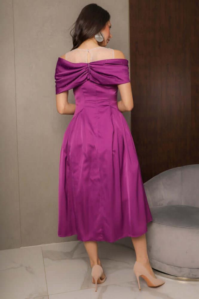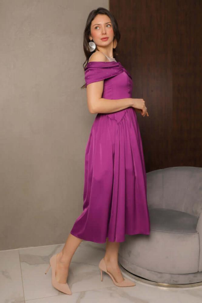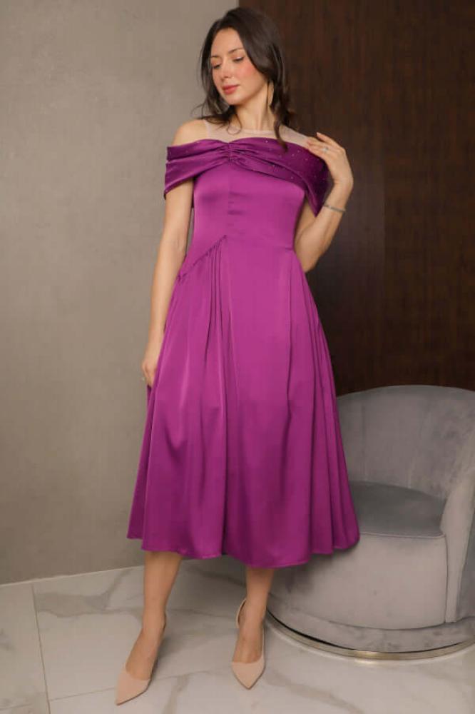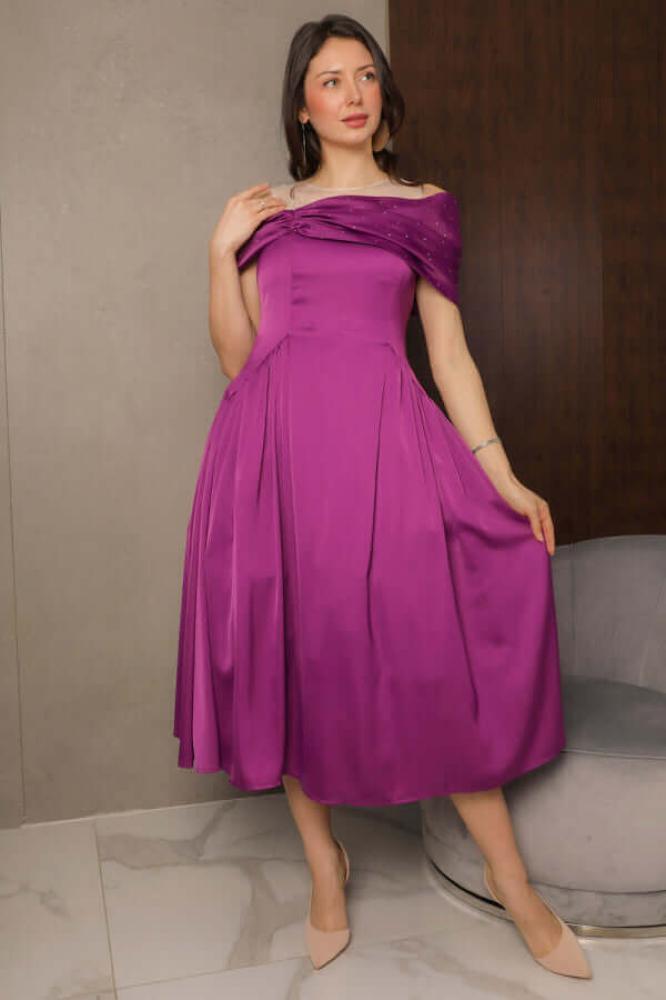 فستان سهرة ميدي بكسرات من الخصر لون بنفسجي