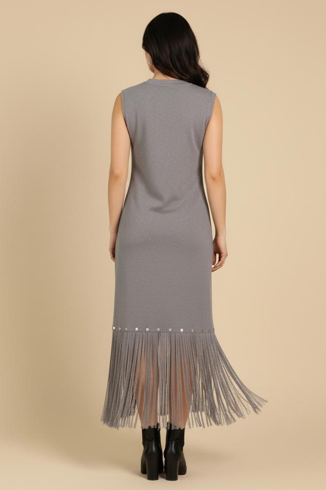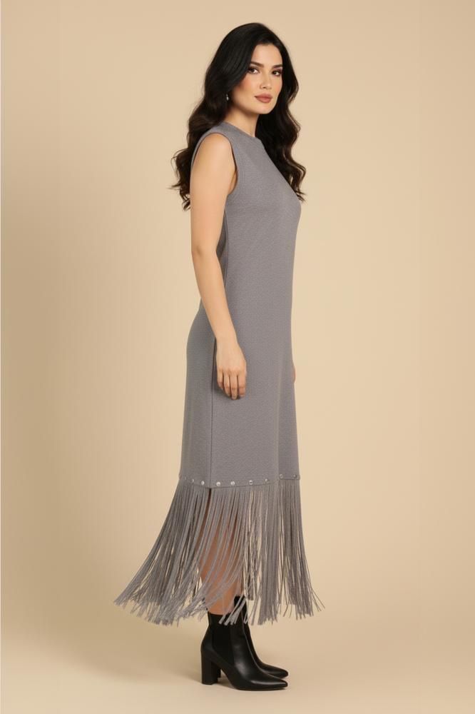 فستان شتوي مزين بهدب بأكمام كت لون رصاصي