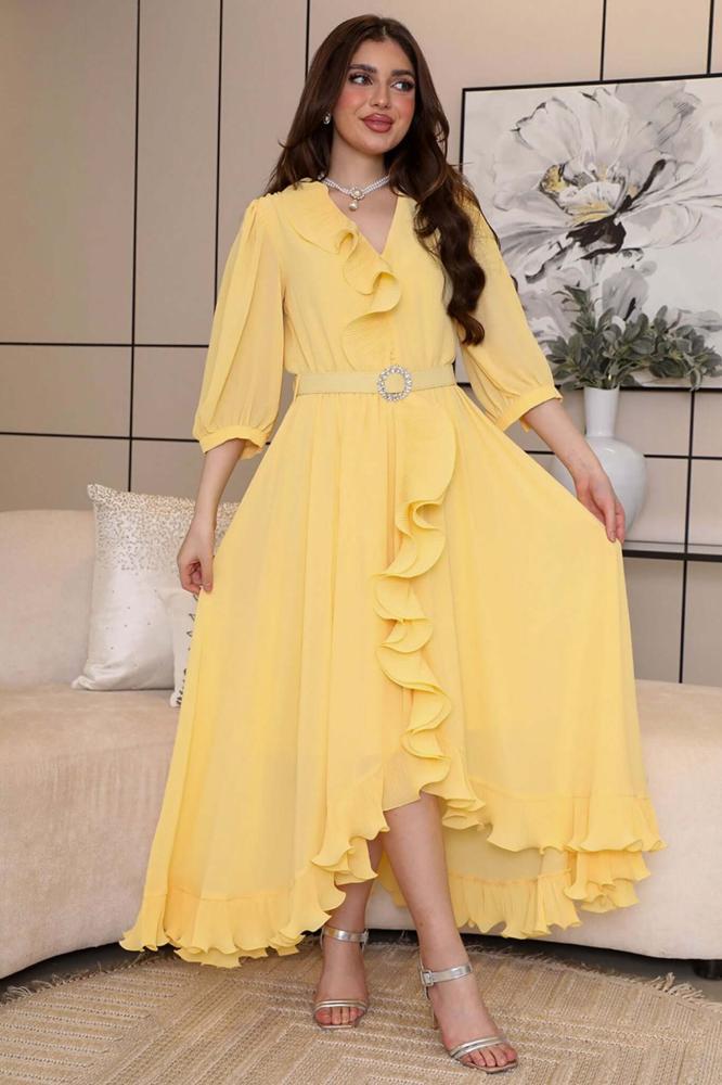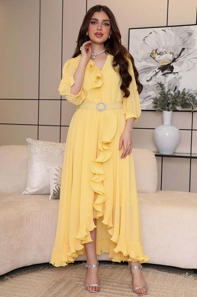 نوع القصة: فستان شيفون أنيق غير متماثل الطول مزين بحزام على الخصر، بأكمام طويلة وياقة V