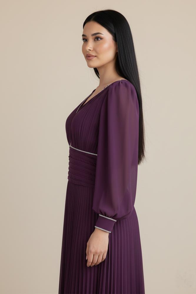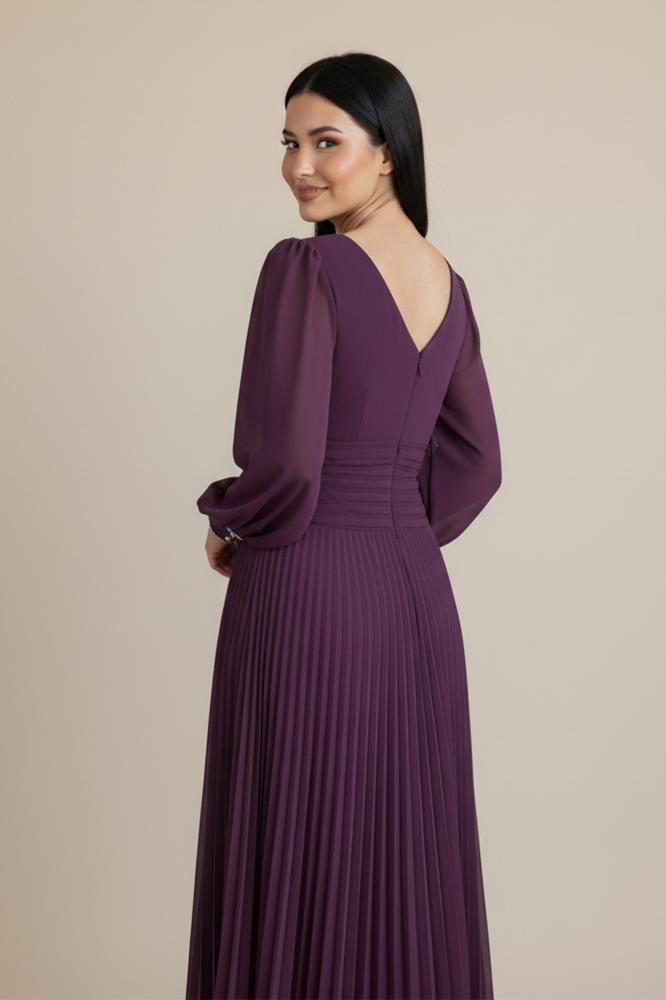 - نوع القصة: فستان طويل بخصر مزموم وتصميم بليسيه مع درابية على الخصر، بياقة V وأكمام طويلة
