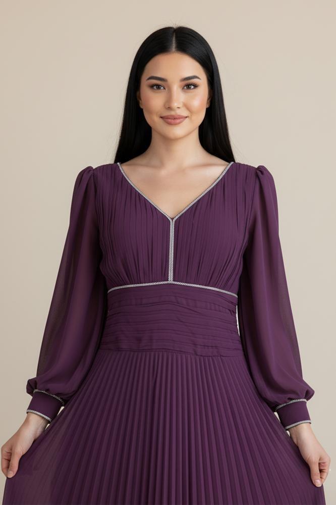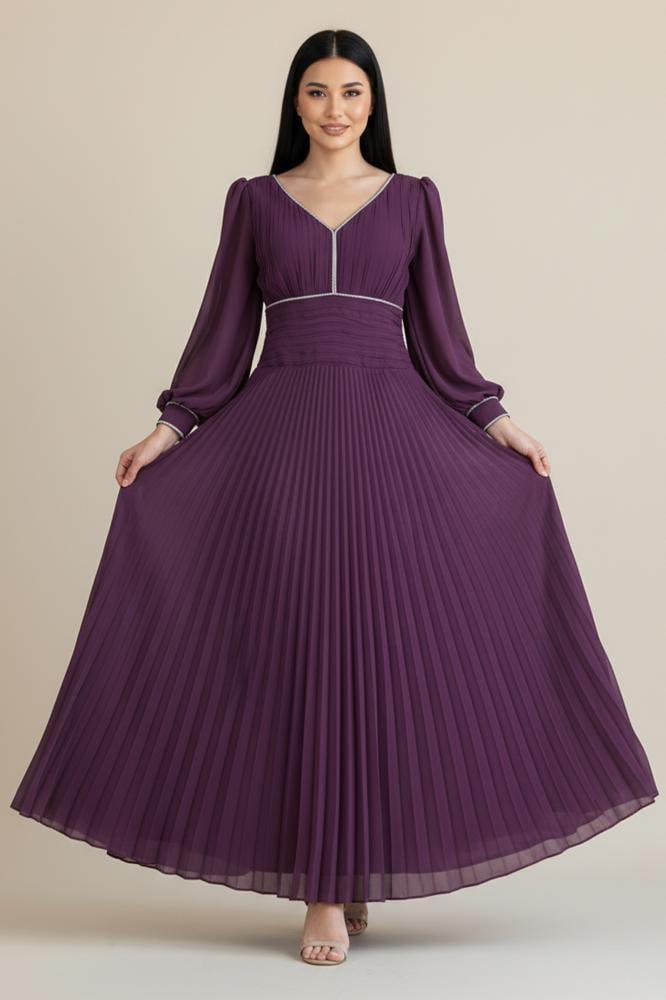 - نوع التصميم: فستان شيفون بليسيه مزين بشريط كريستال