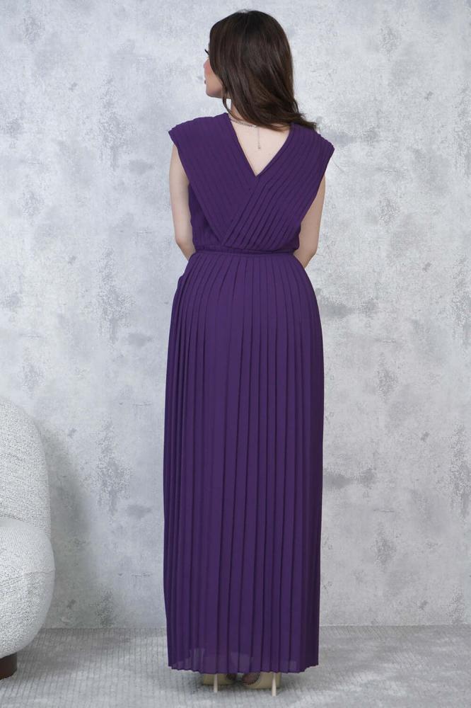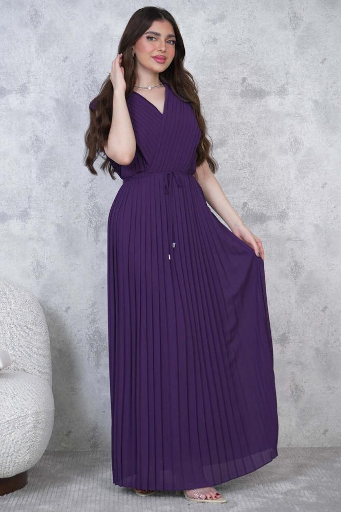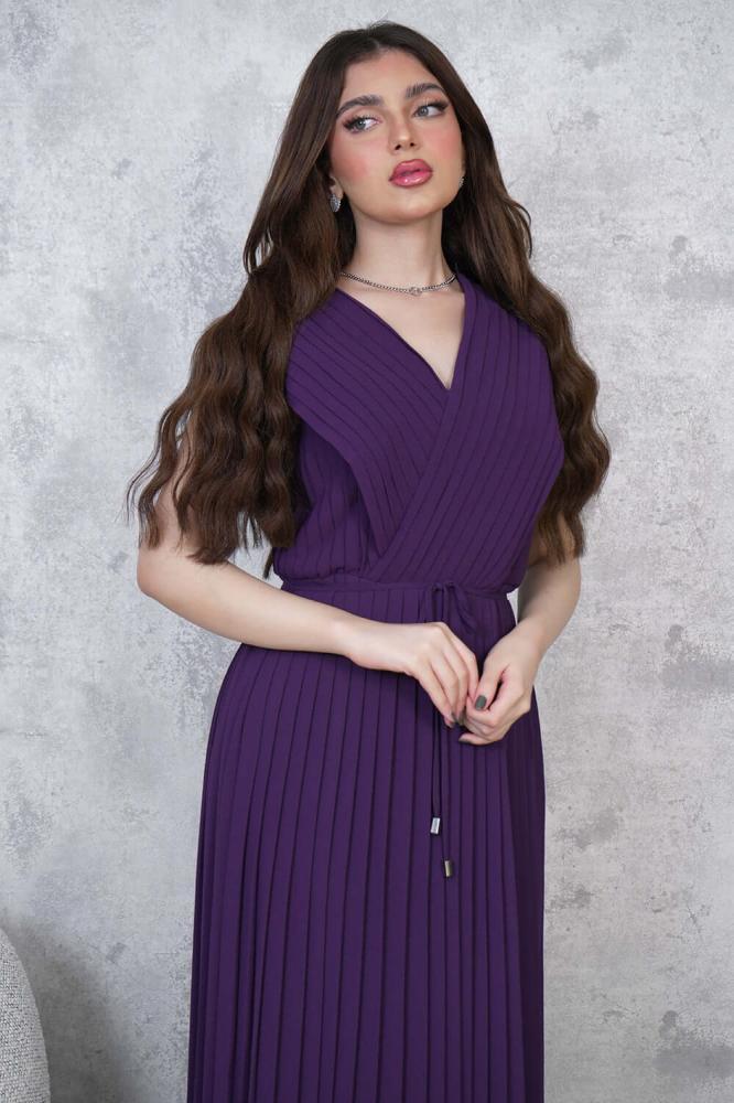 - نوع القصة: فستان شيفون طويل بليسيه برباط على الخصر بياقة V