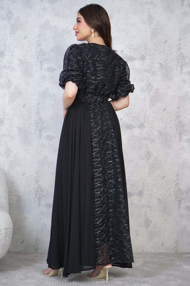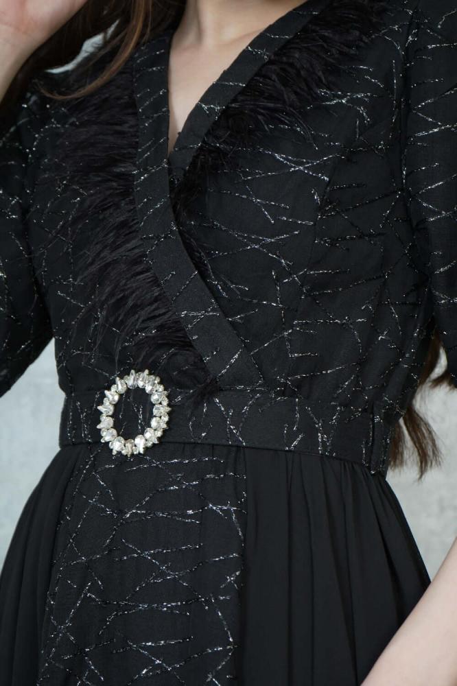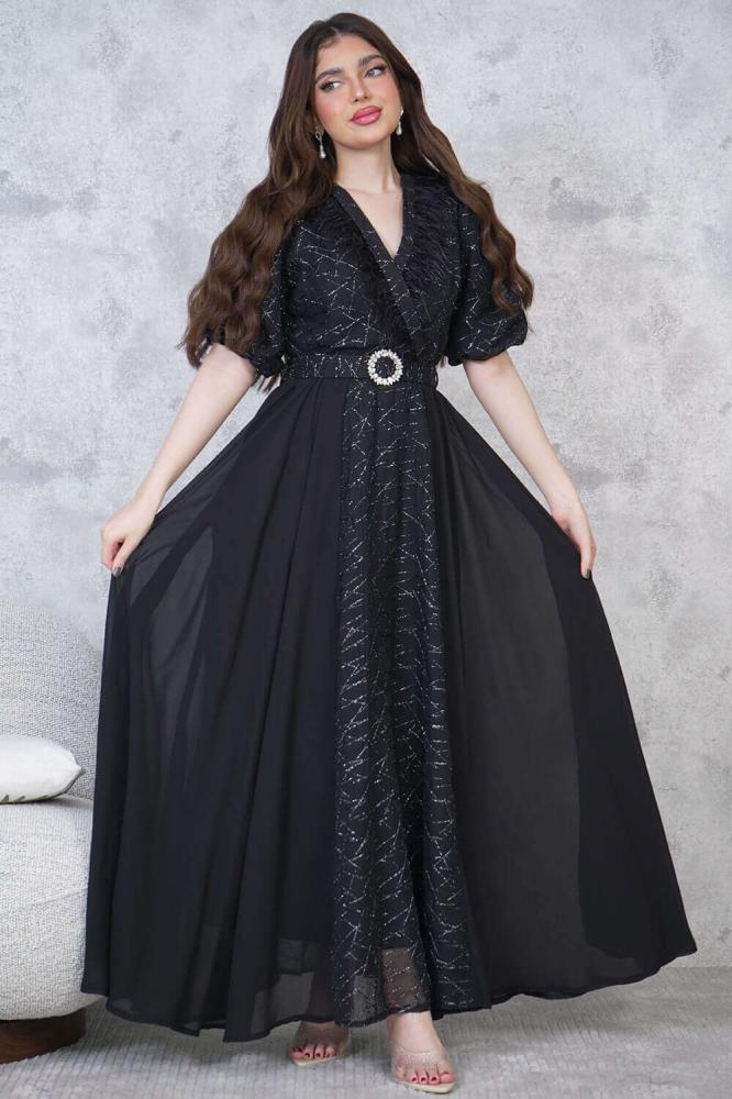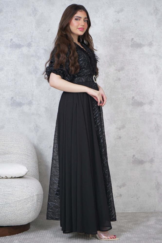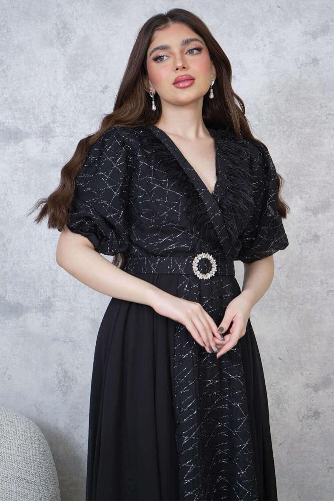 • نوع القصة: فستان طويل مزين بريش، بأكمام بف قصيرة، وياقة V، مزود بحزام على الخصر
