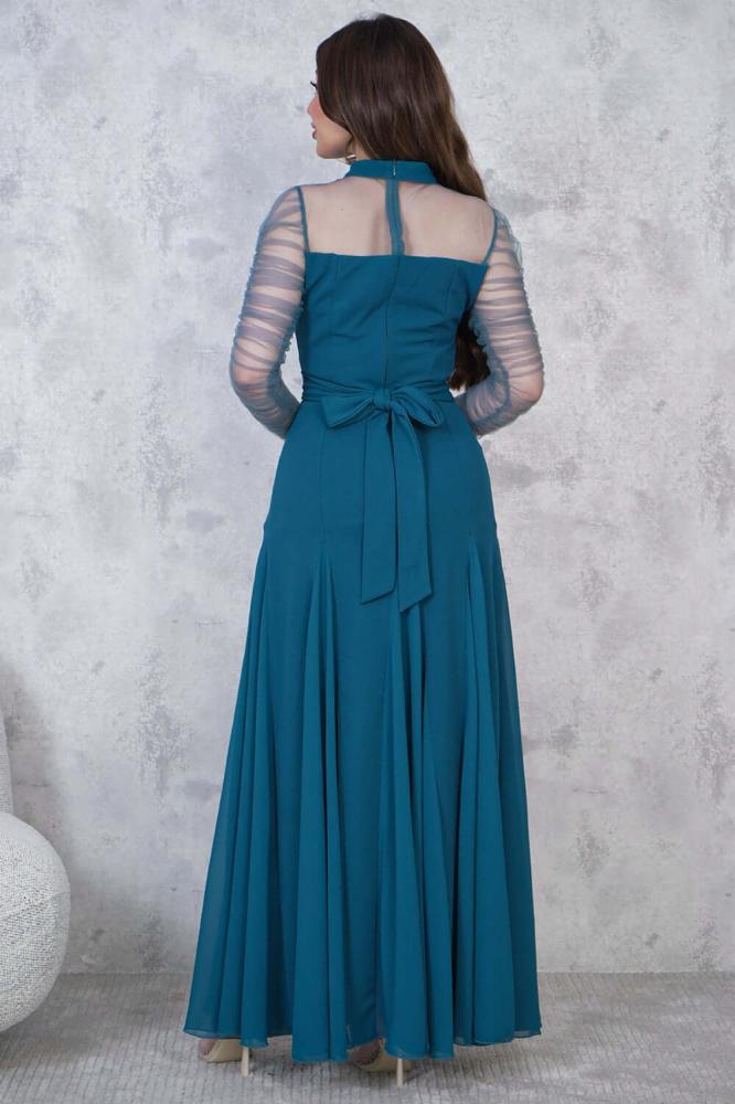 - نوع التصميم: فستان طويل بأكمام تل مزمومة