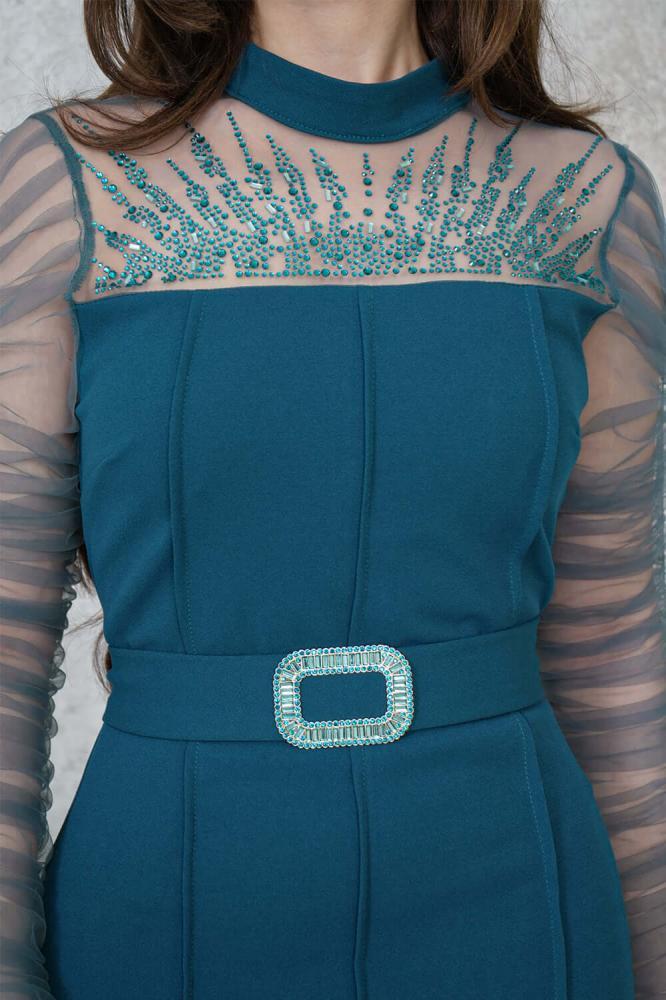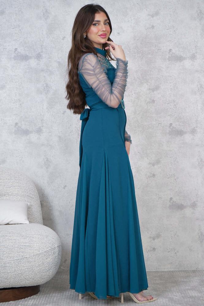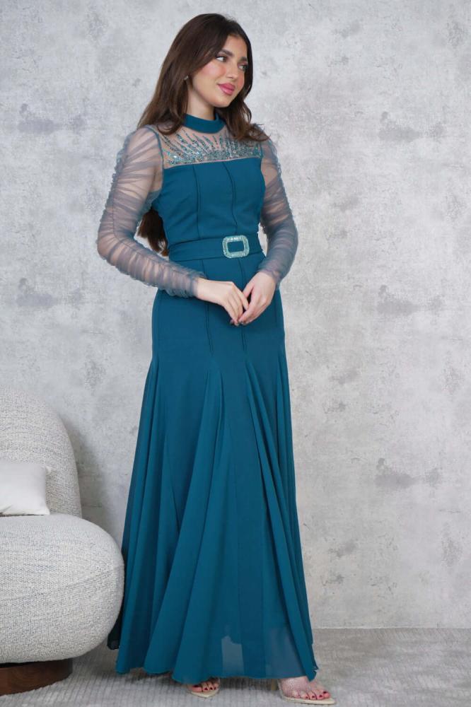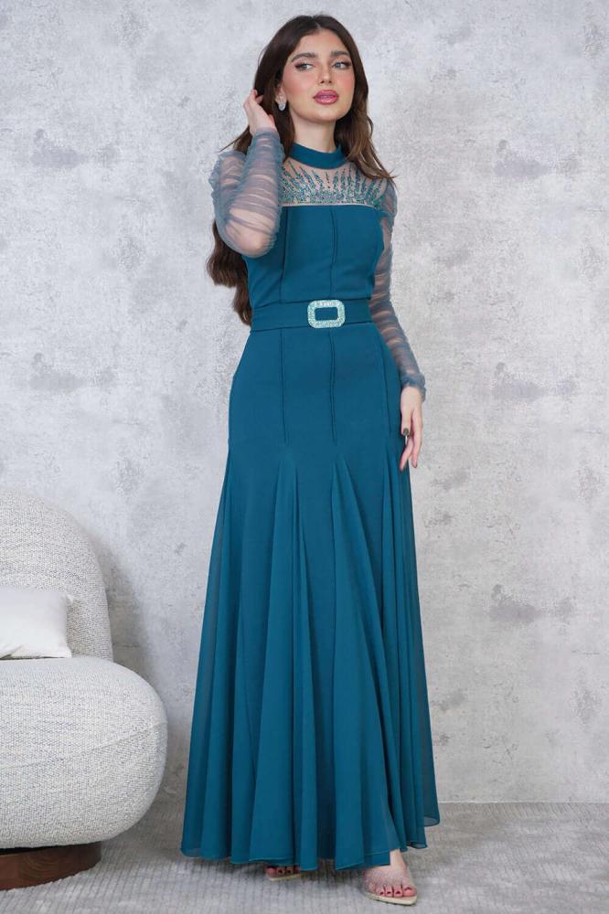 - نوع القصة: فستان طويل ضيق مزين بفصوص، بحزام على الخصر، أكمام طويلة مزمومة، وياقة دائرية ضيقة