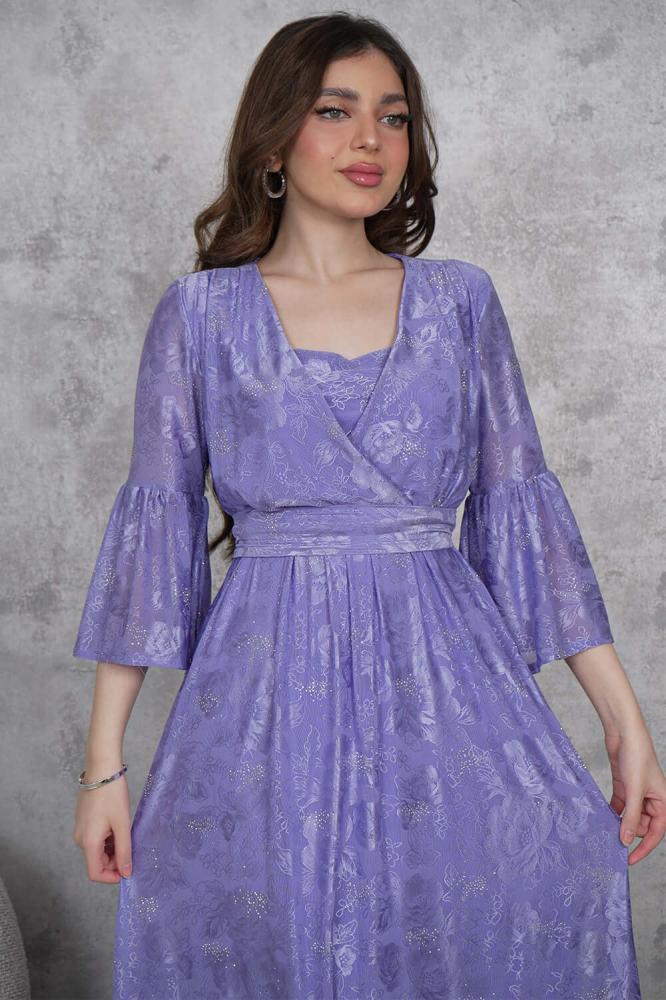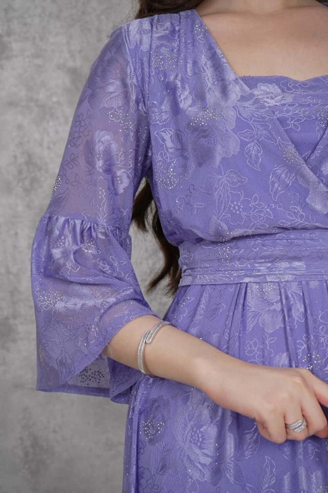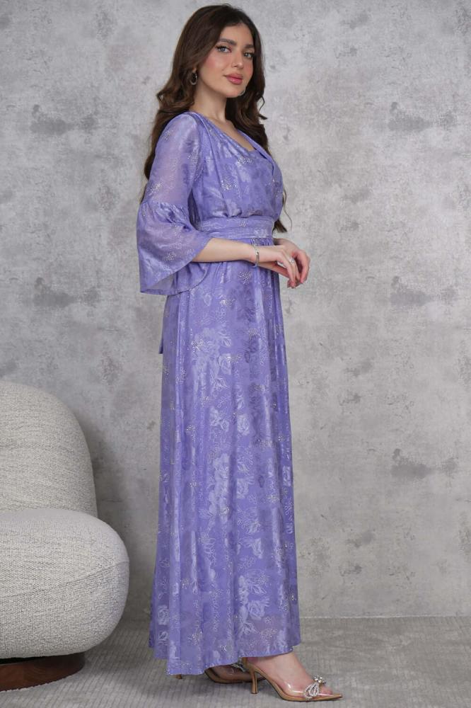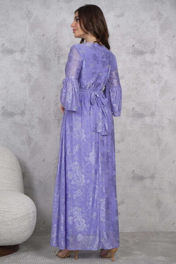 - نوع القصة: فستان طويل تل مزين بفصوص برباط على الخصر بياقة V وأكمام 3/4