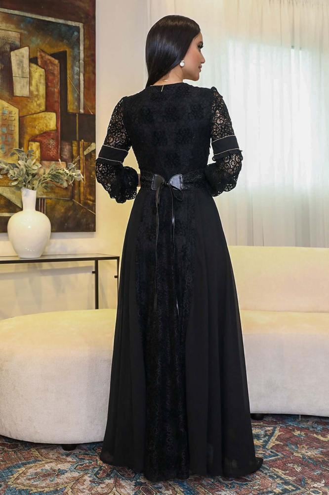 • نوع القصة: فستان طويل دانتيل شيفون بحزام على الخصر، وياقة V، بأكمام طويلة