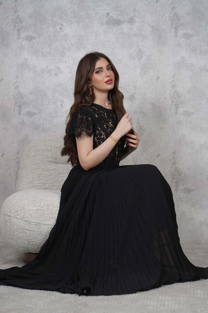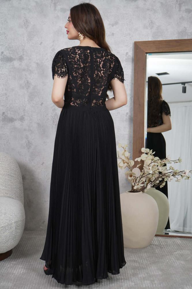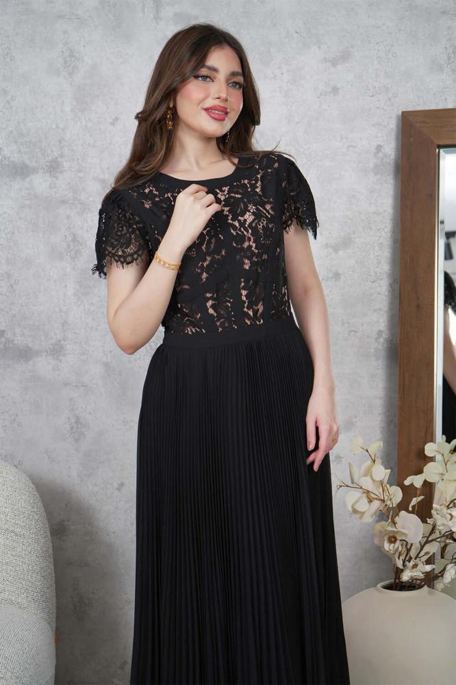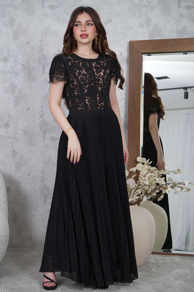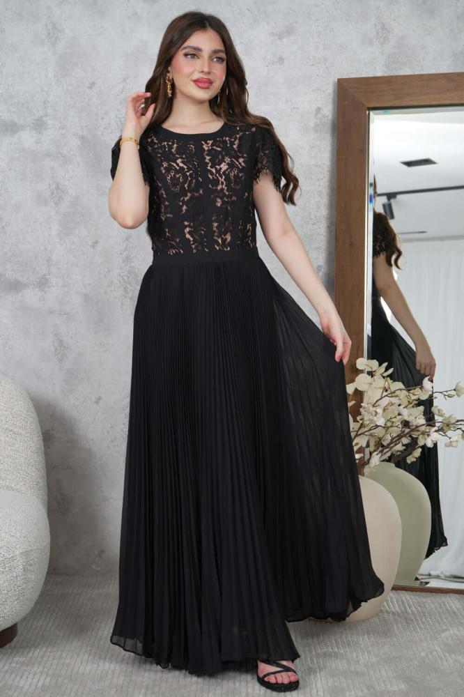 - نوع القصة: فستان طويل شيفون بليسيه بياقة دائرية وأكمام قصيرة من الدانتيل