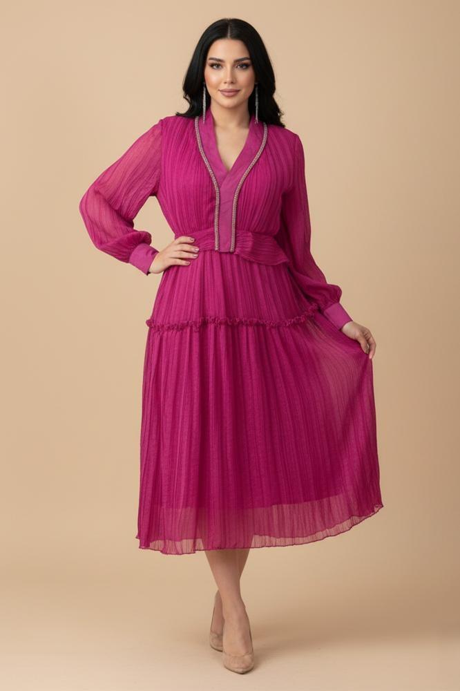 - نوع التصميم: فستان سهرة شيفون بقصة بليسيه ميدي