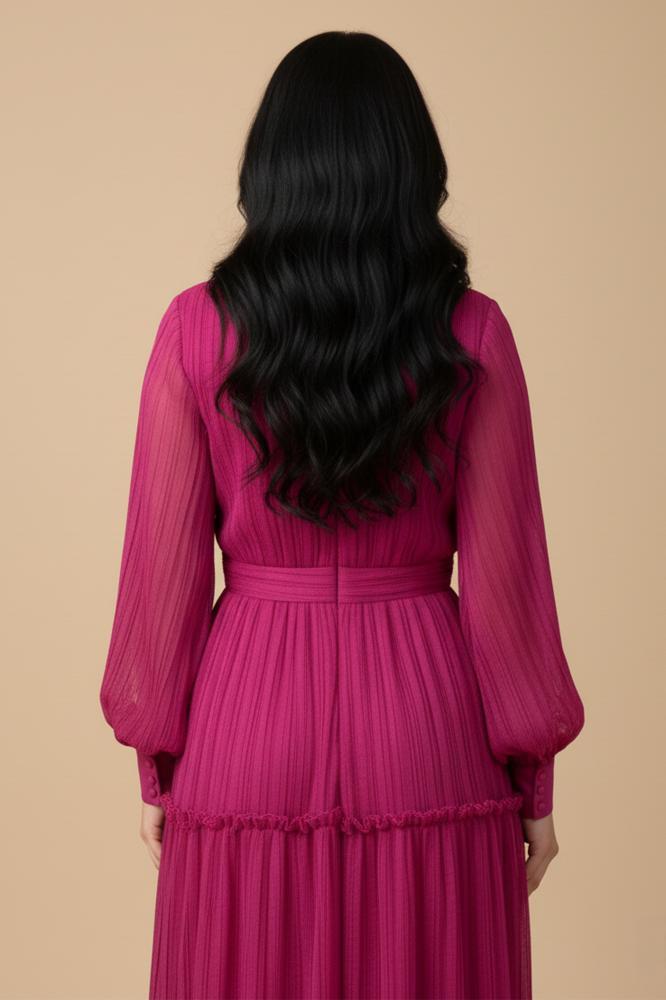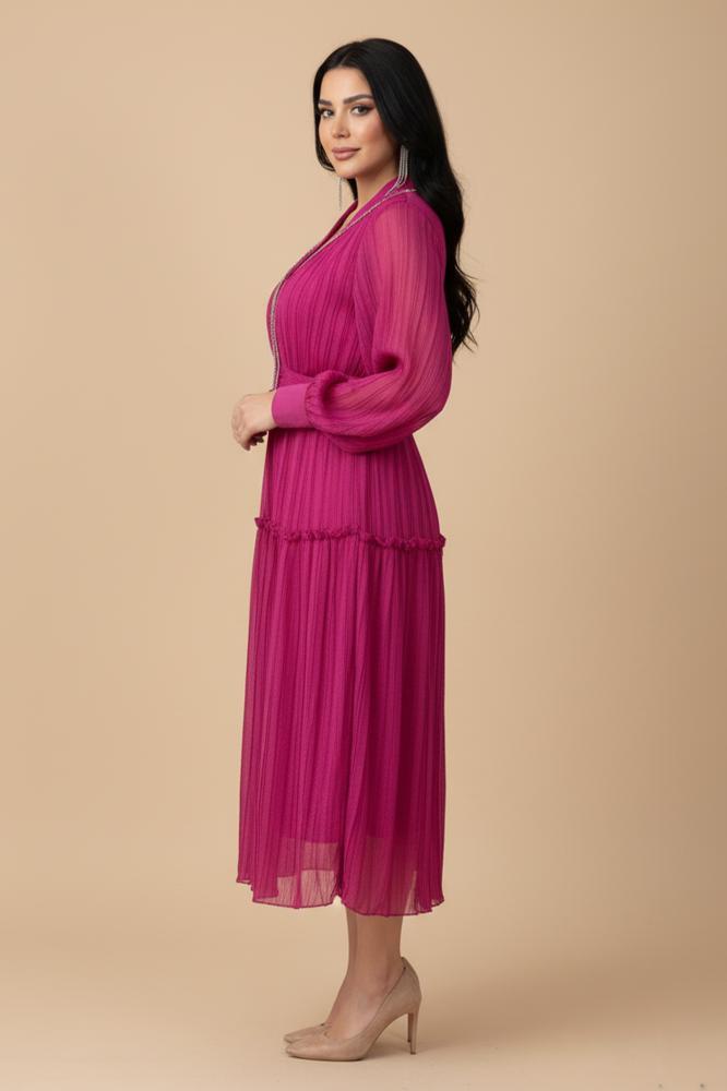 - نوع القصة: فستان سهرة ميدي شيفون بكسرات وياقة قميص واسعة مع أكمام طويلة