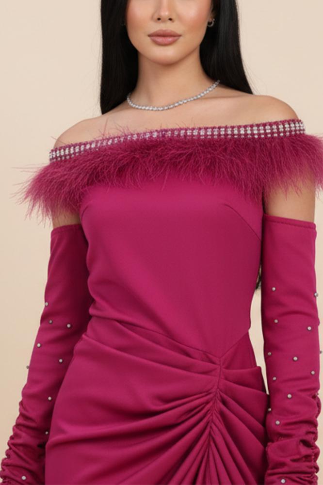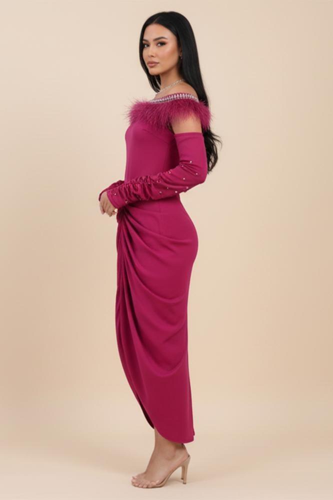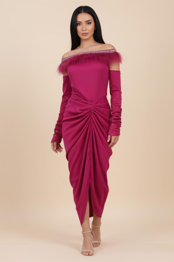 • نوع التصميم: فستان ميدي بياقة مطرزة ومزينة بريش
