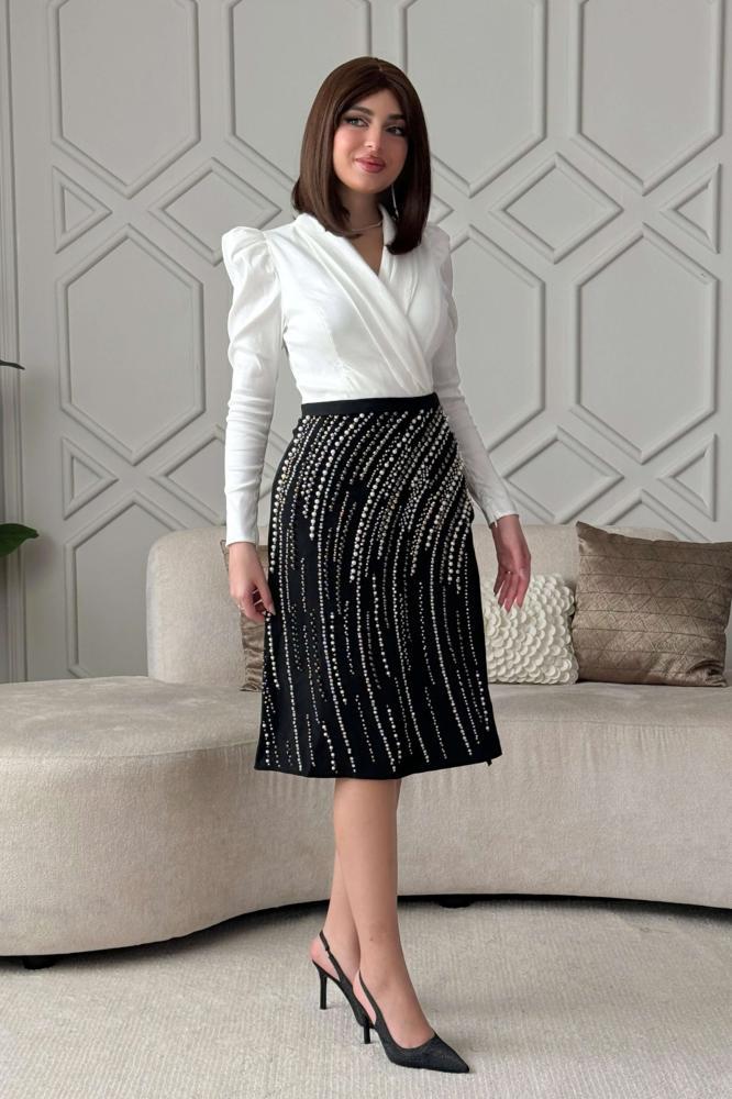 - نوع القصة: فستان قصير تفته مزين باللؤلؤ بأكمام طويلة بياقة مطوية