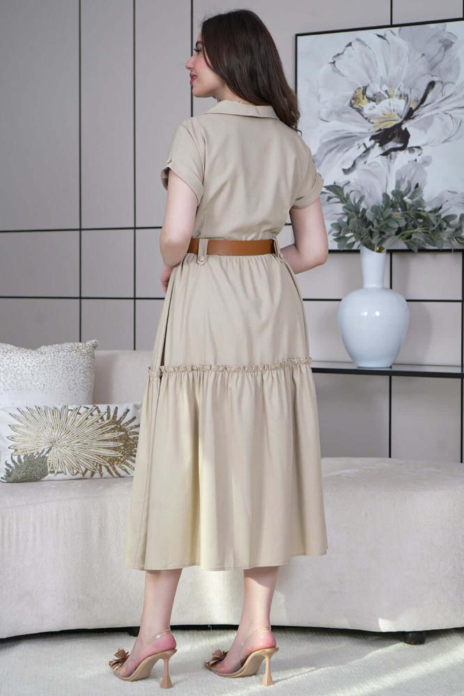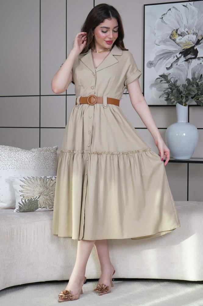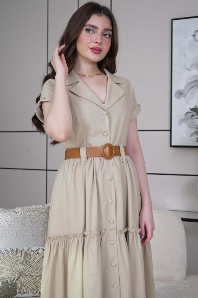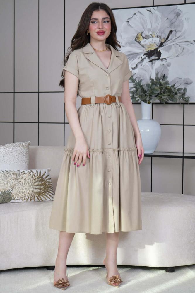 - نوع القصة: فستان ميدي كتان بحزام على الخصر، بأكمام قصيرة وياقة مطوية