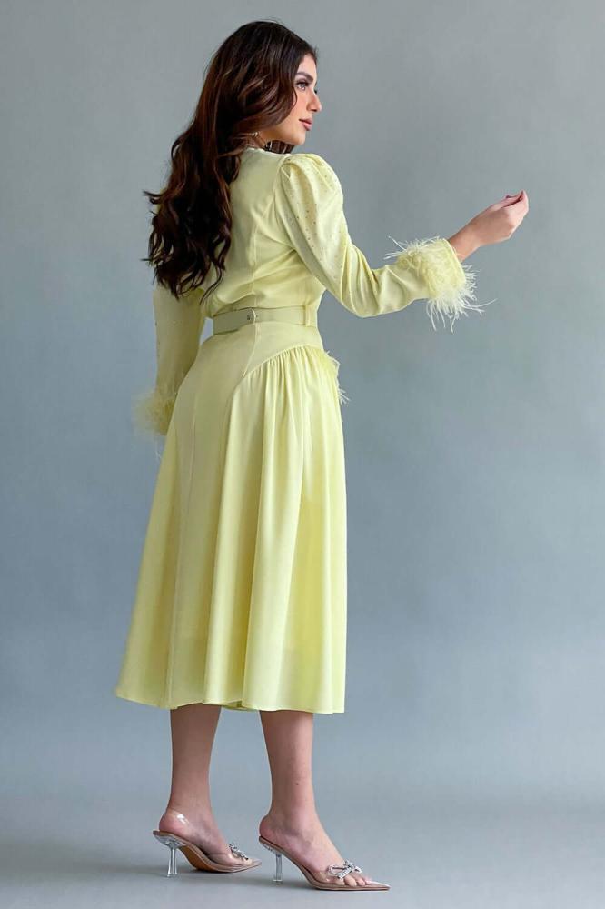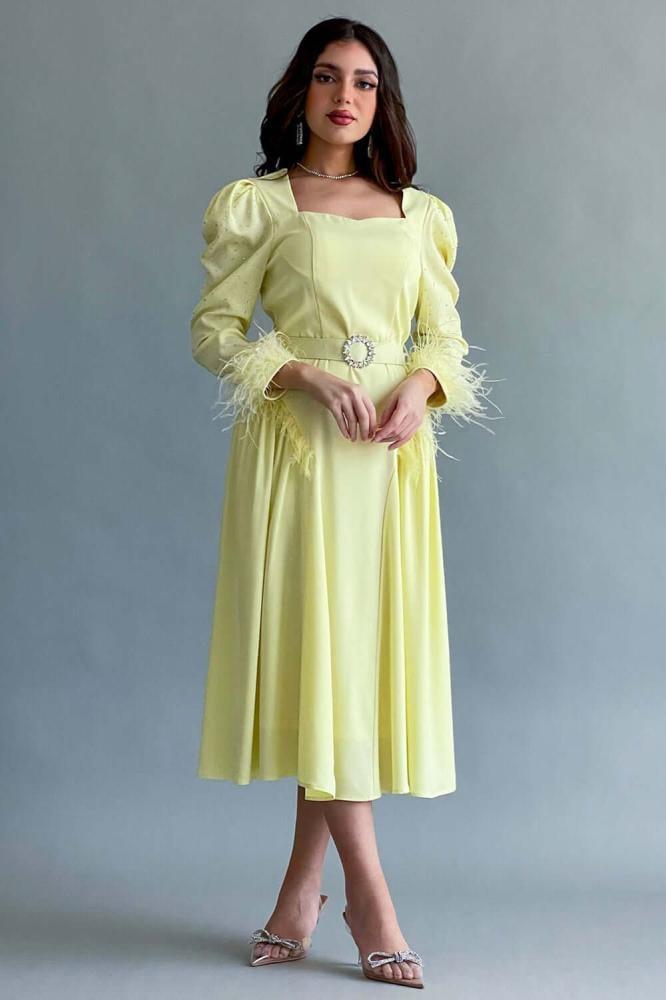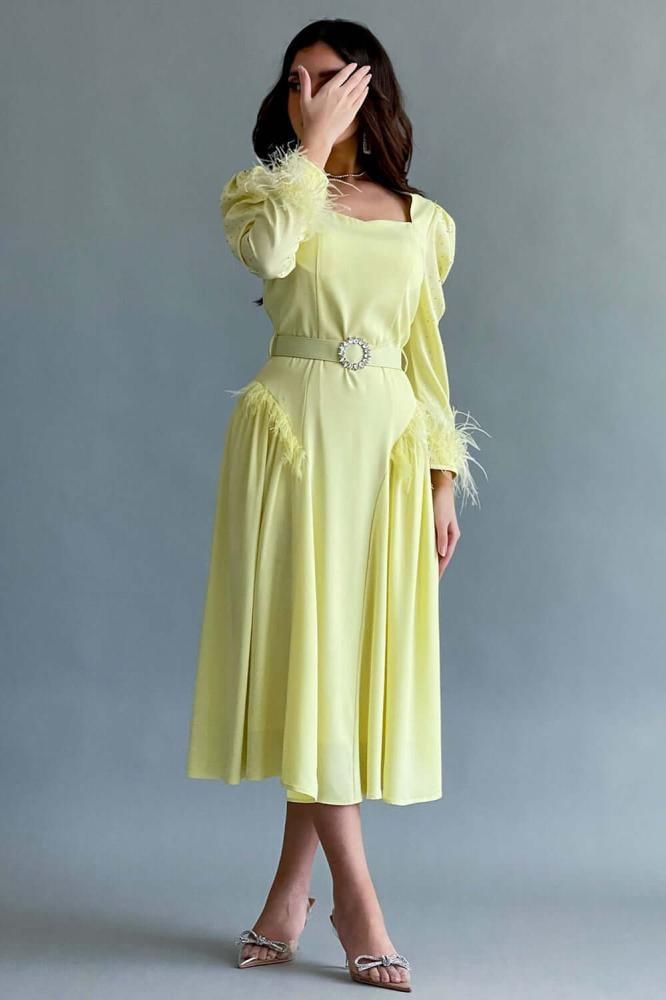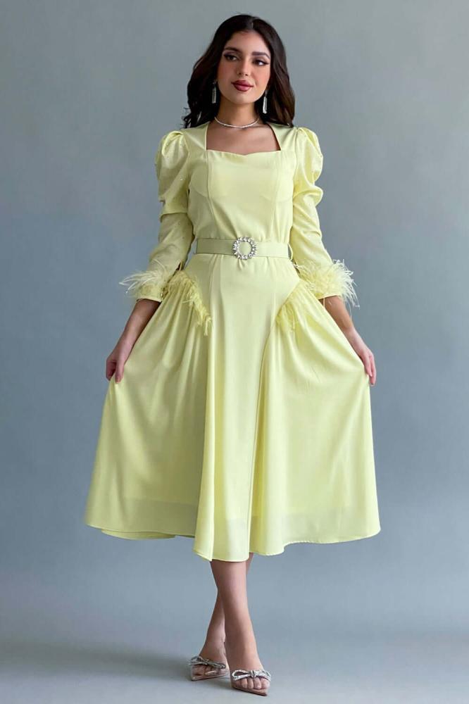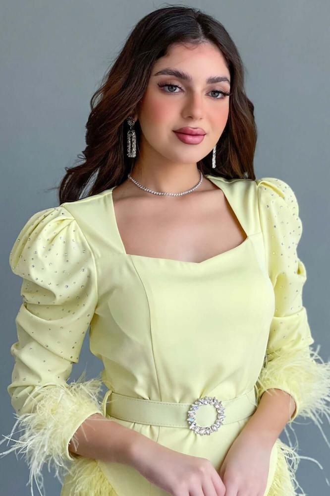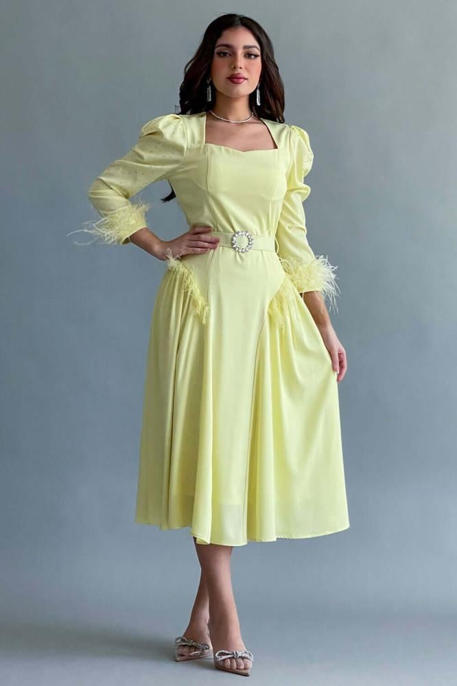 - نوع القصة: فستان كريب ميدي بياقة مربعة وأكمام طويلة، مزين بالريش وحزام كريستال