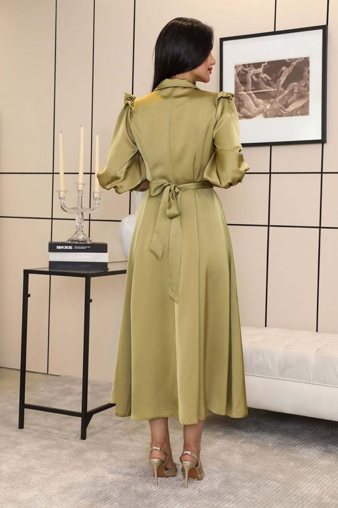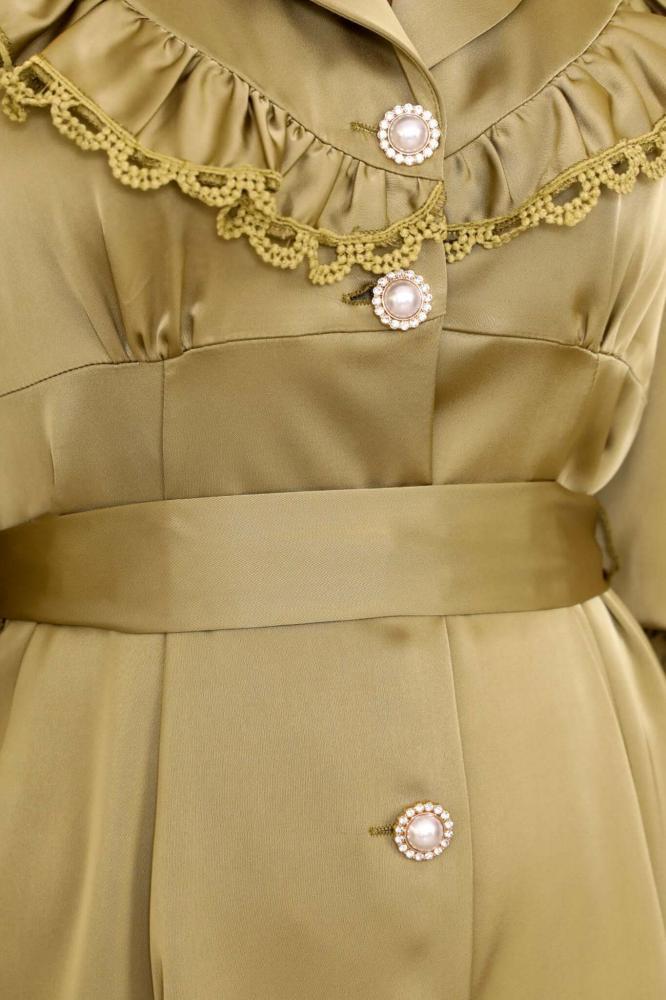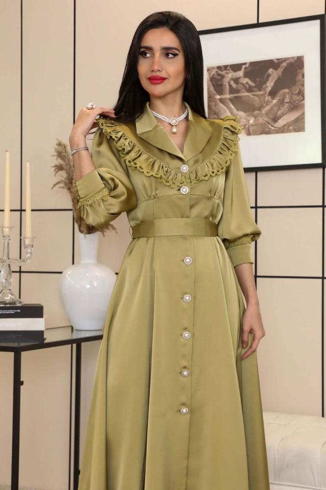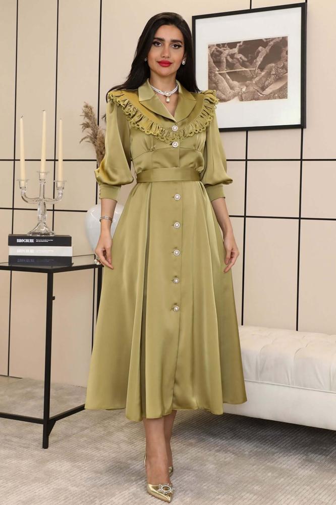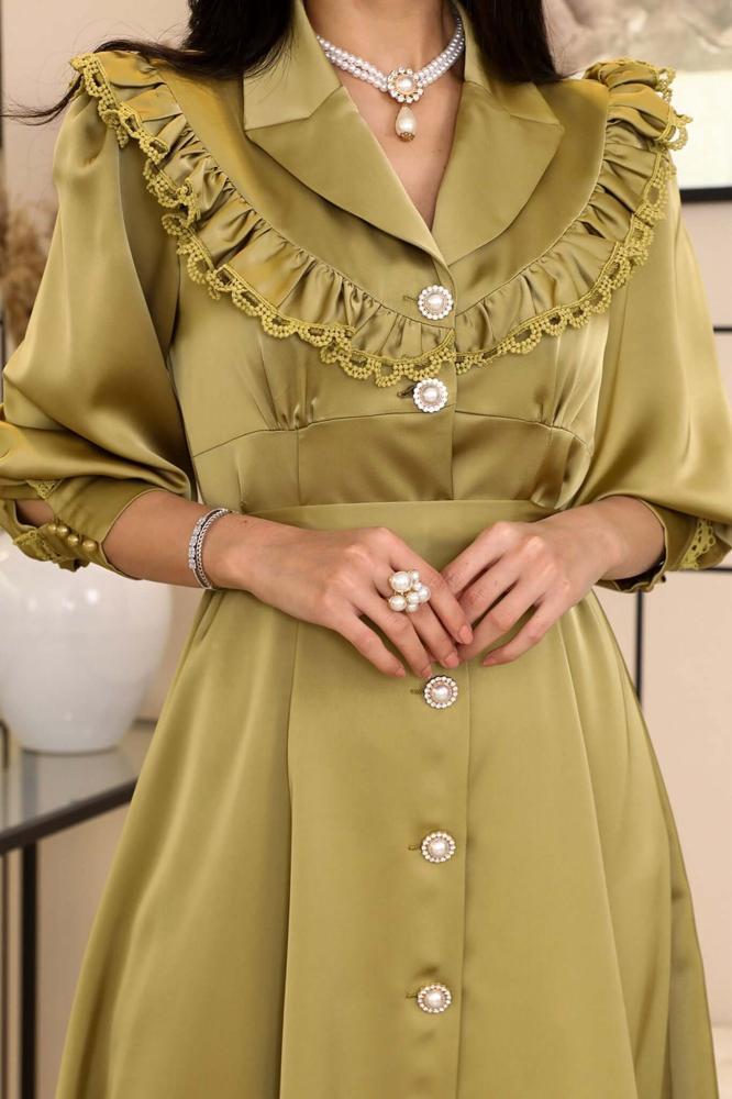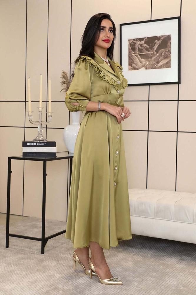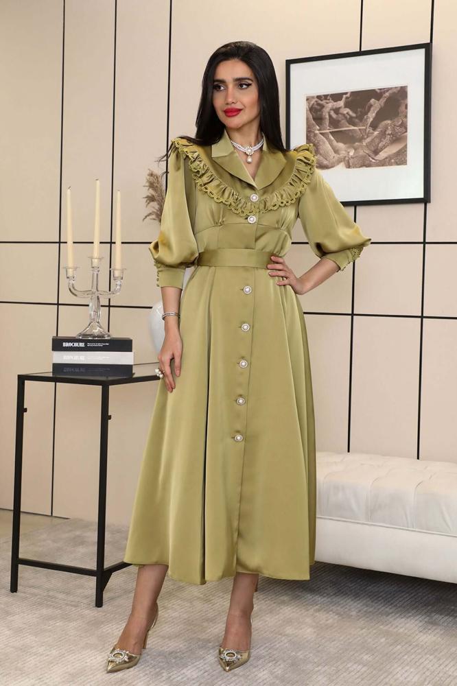 - نوع التصميم: فستان كلاسيكي مزين بأزرار من اللؤلؤ