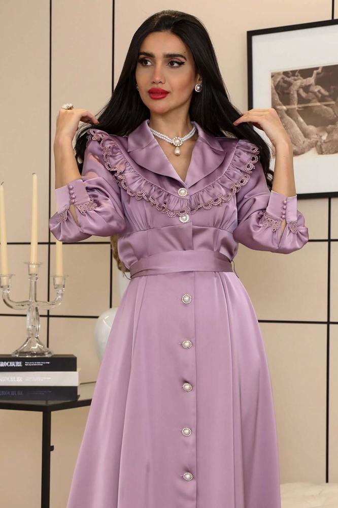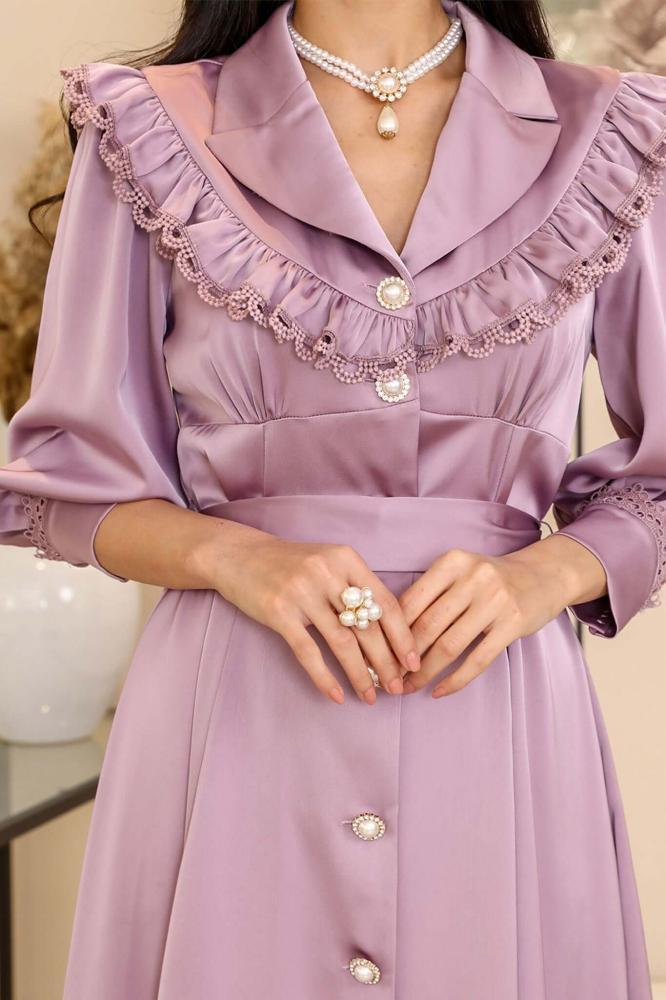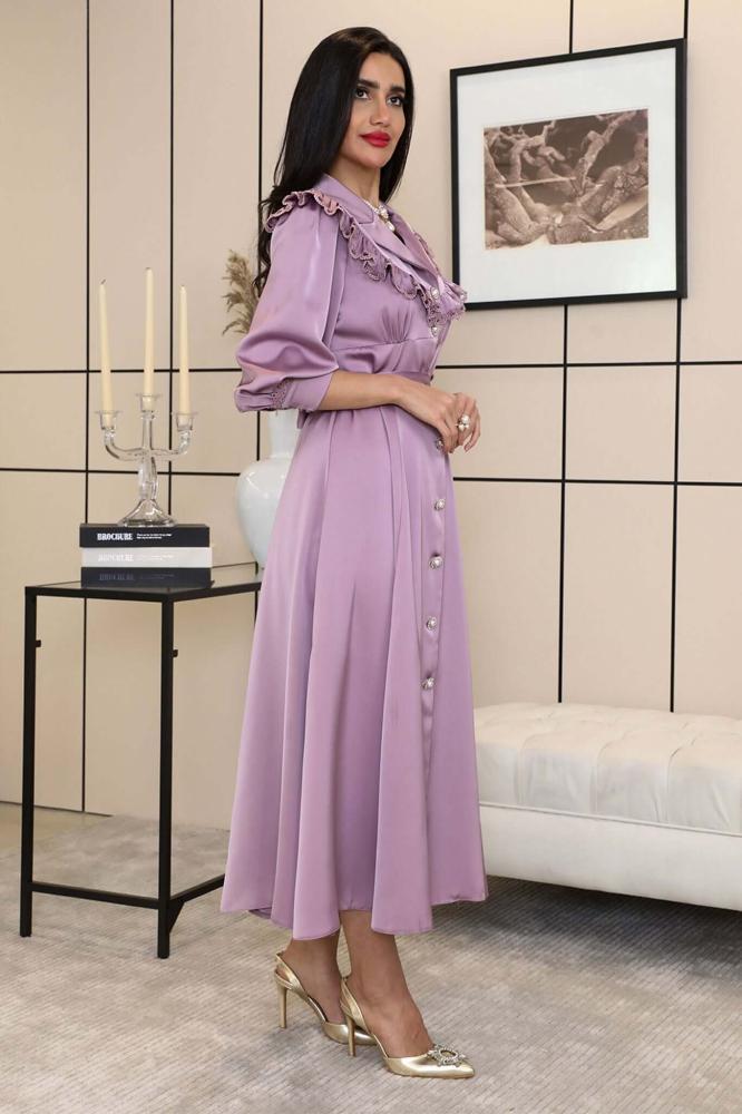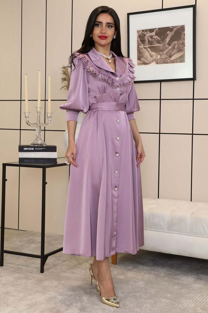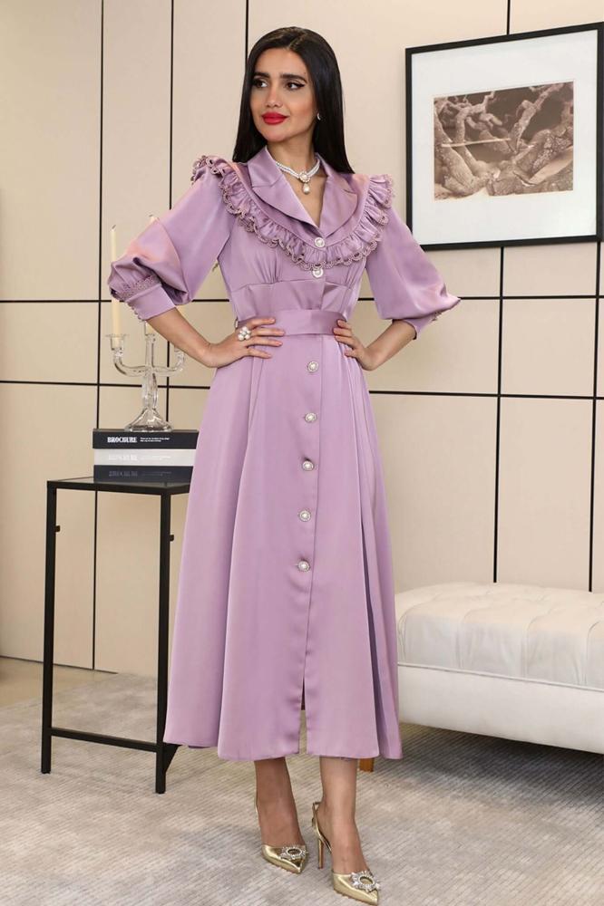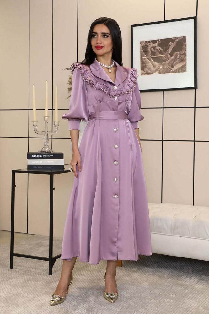 - نوع التصميم: فستان كلاسيكي مزين بأزرار من اللؤلؤ