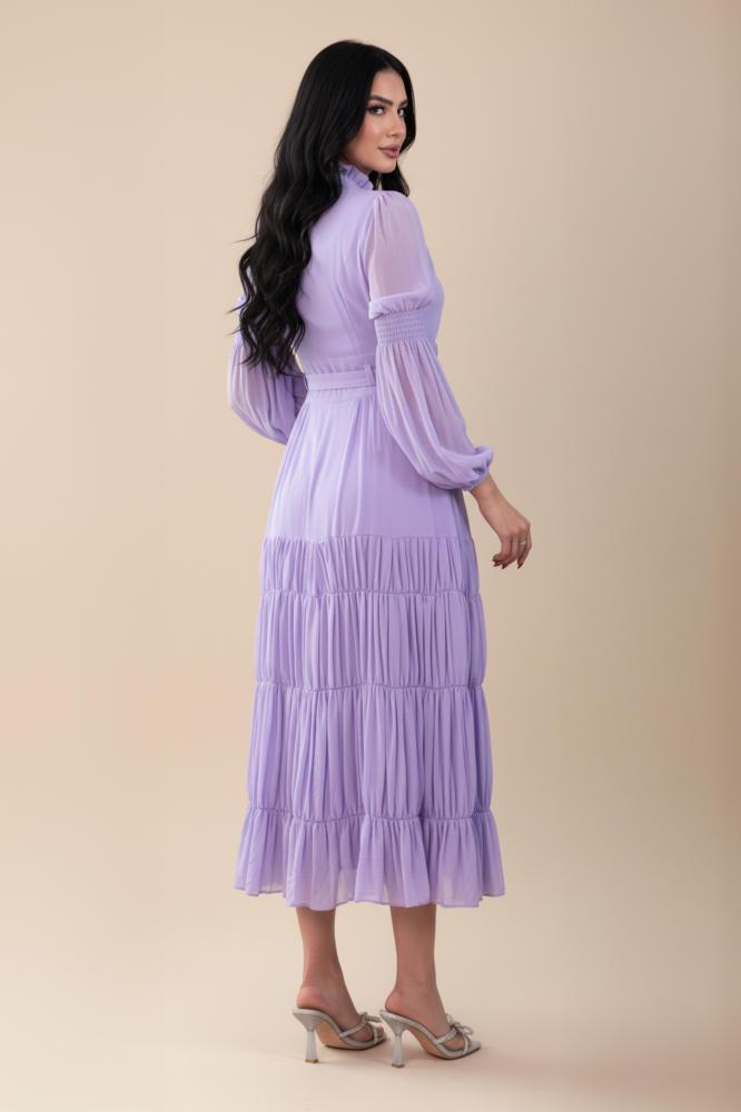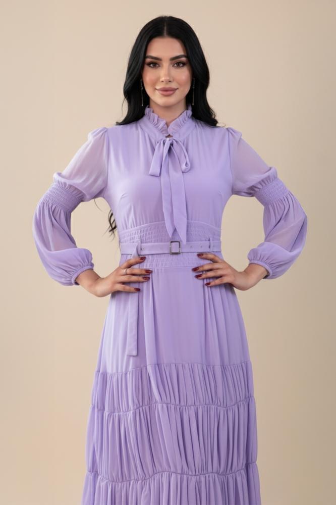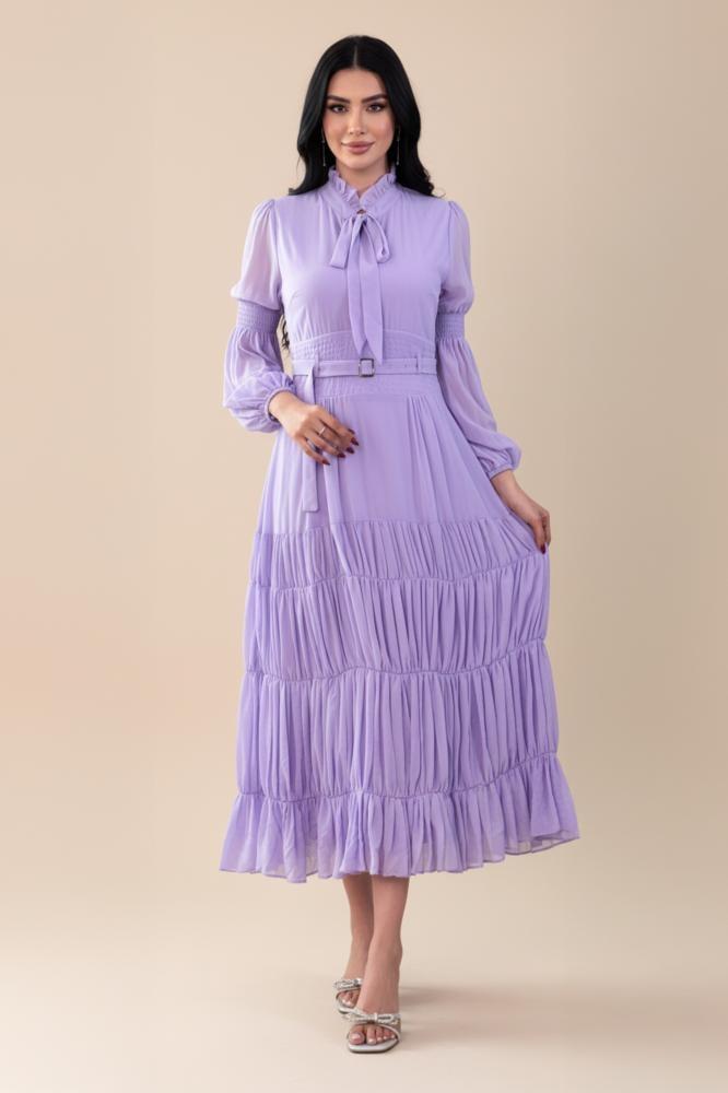 - نوع التصميم: فستان ميدي بطبقات مزمومة بحزام على الخصر