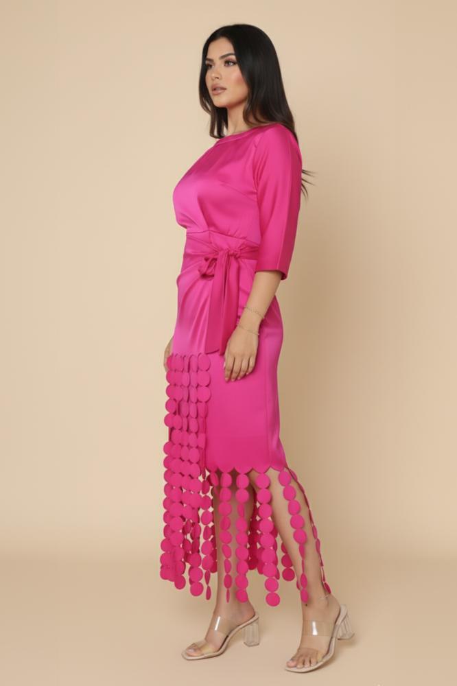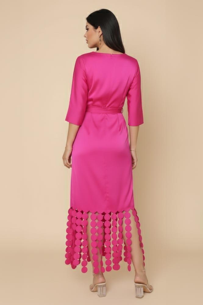 - نوع التصميم: فستان لف مزين بشراشيب