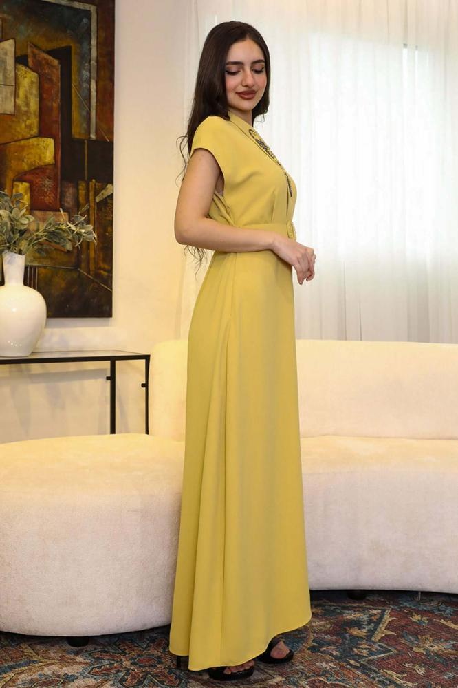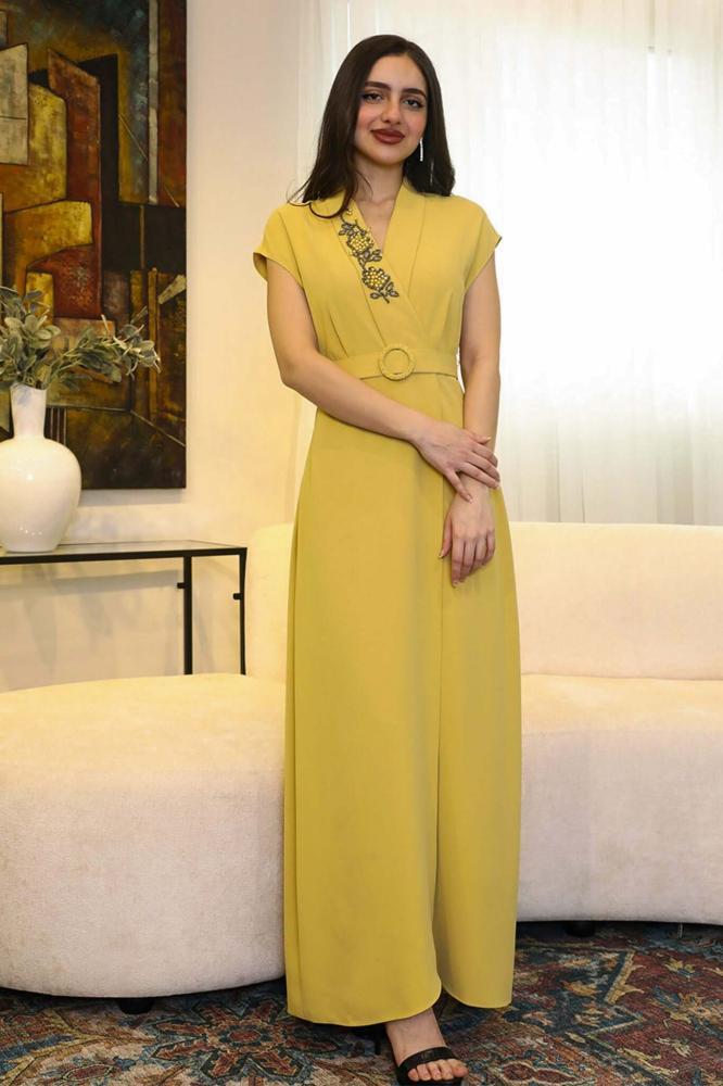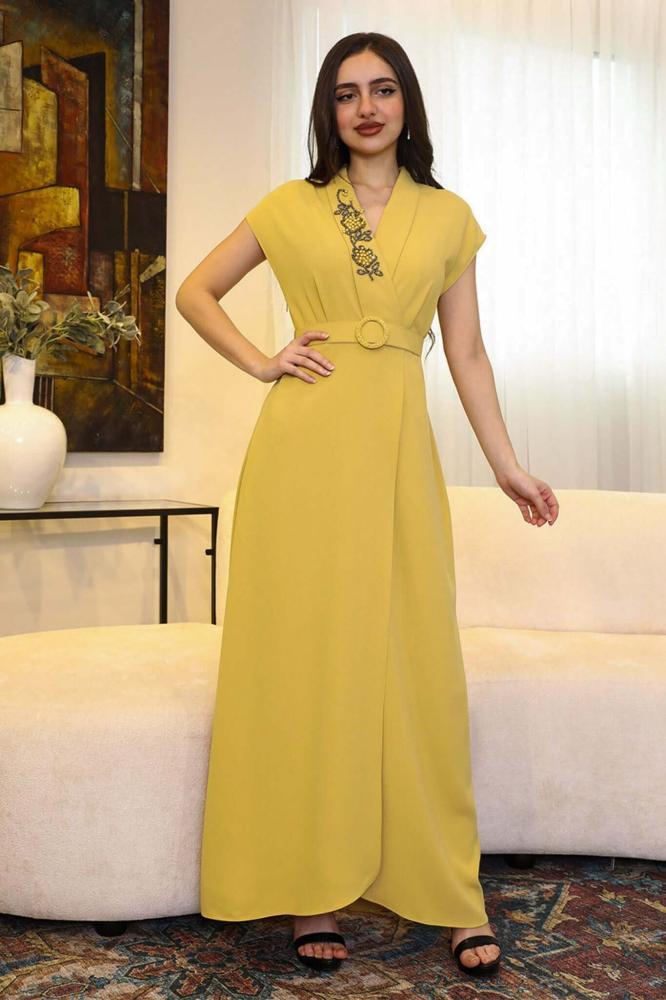 - نوع القصة: فستان ماكسي بحزام وياقة مزينة باللؤلؤ