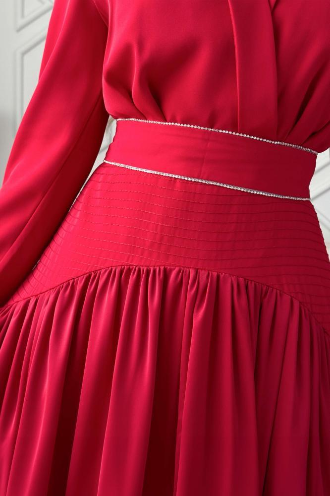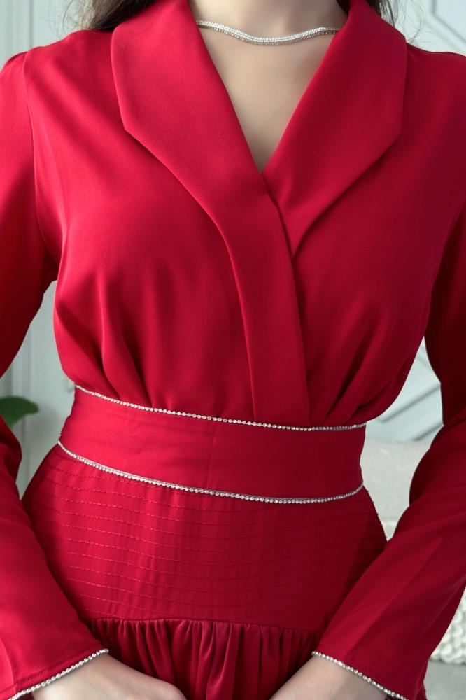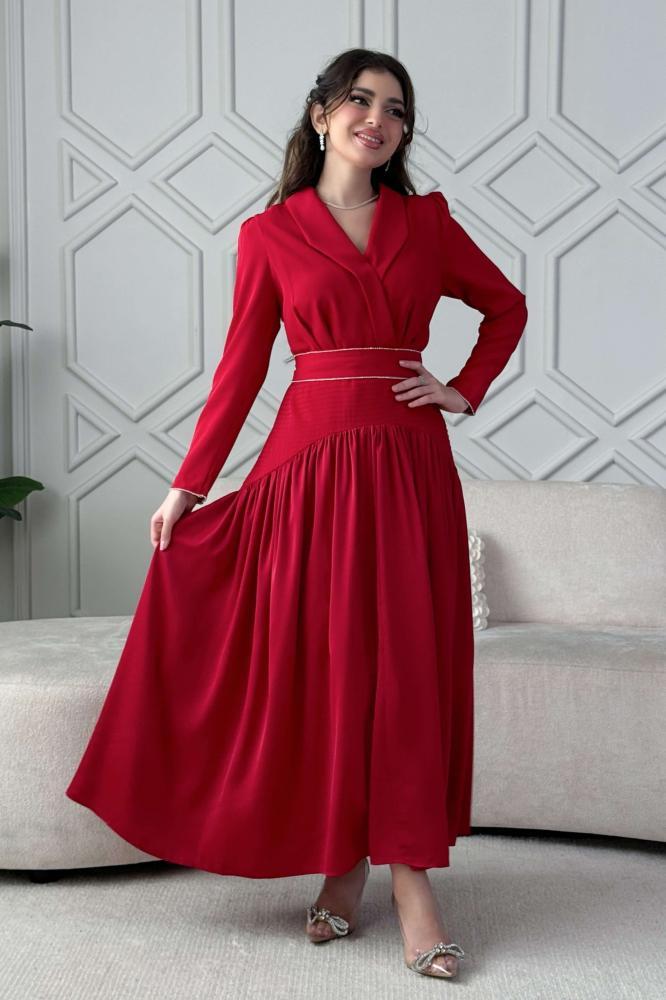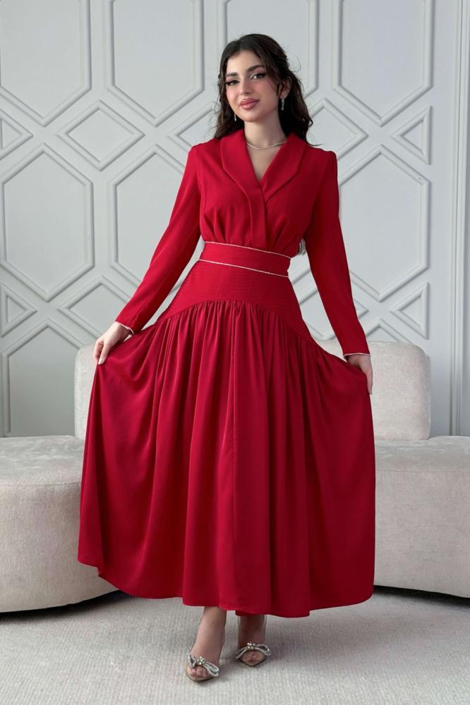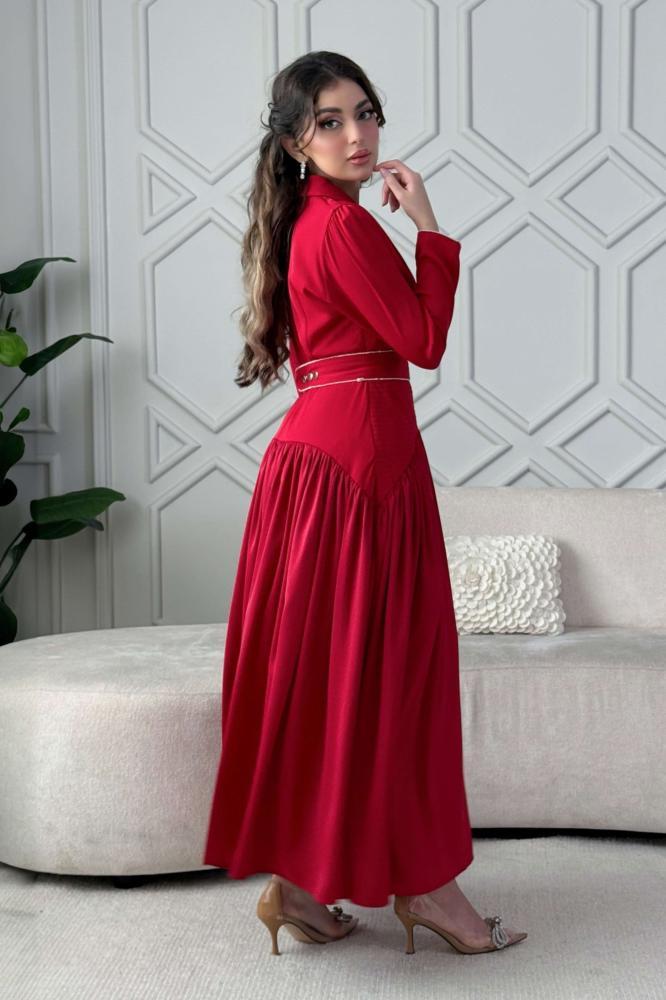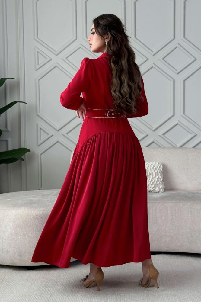 - نوع القصة: فستان ماكسي بحزام مزين بالفصوص بأكمام طويلة وياقة مطوية