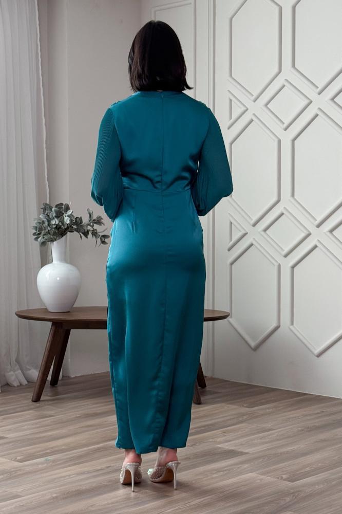 نوع القصة: فستان ماكسي بليسيه مزين بالخرز والكريستال بخصر درابيه بأكمام طويلة وياقة V